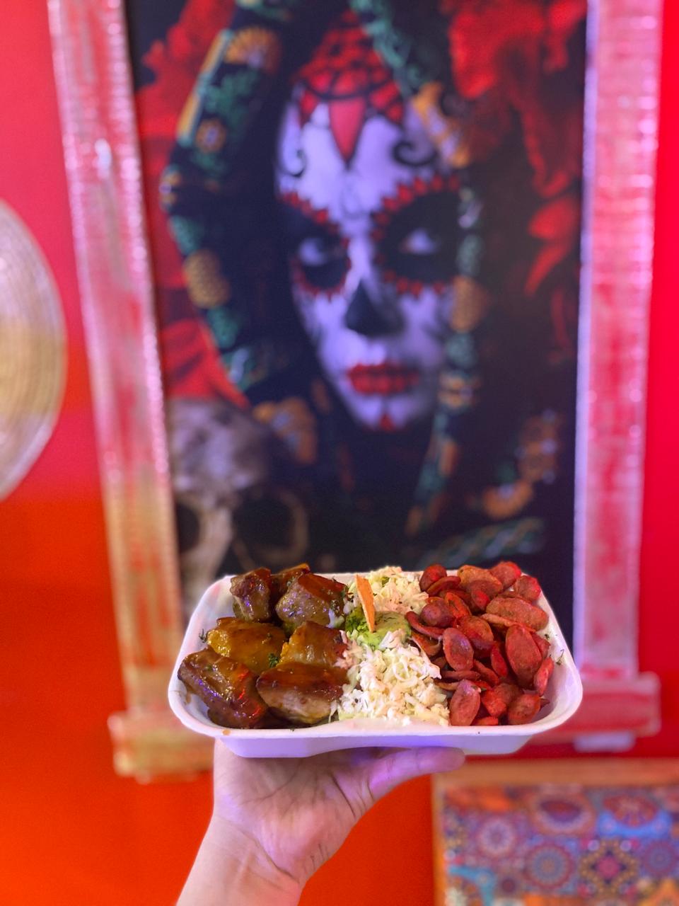 Cerdo, piña en trozos, pico de gallo, salsa de la casa.