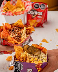 Doritos en salsa de la casa, acompañado de carne, pollo, maíz, pico de gallo, queso, salsa de chile dulce.