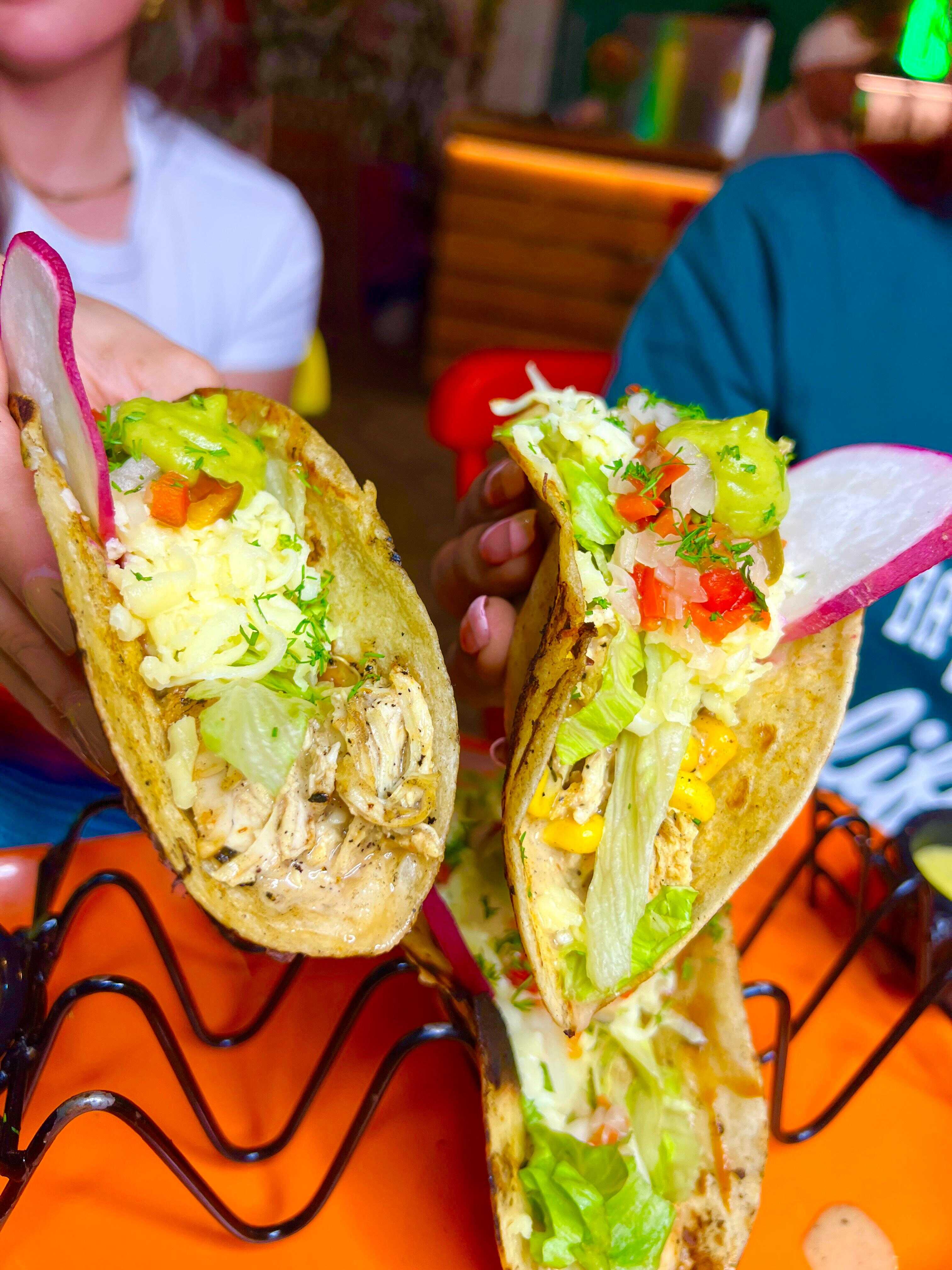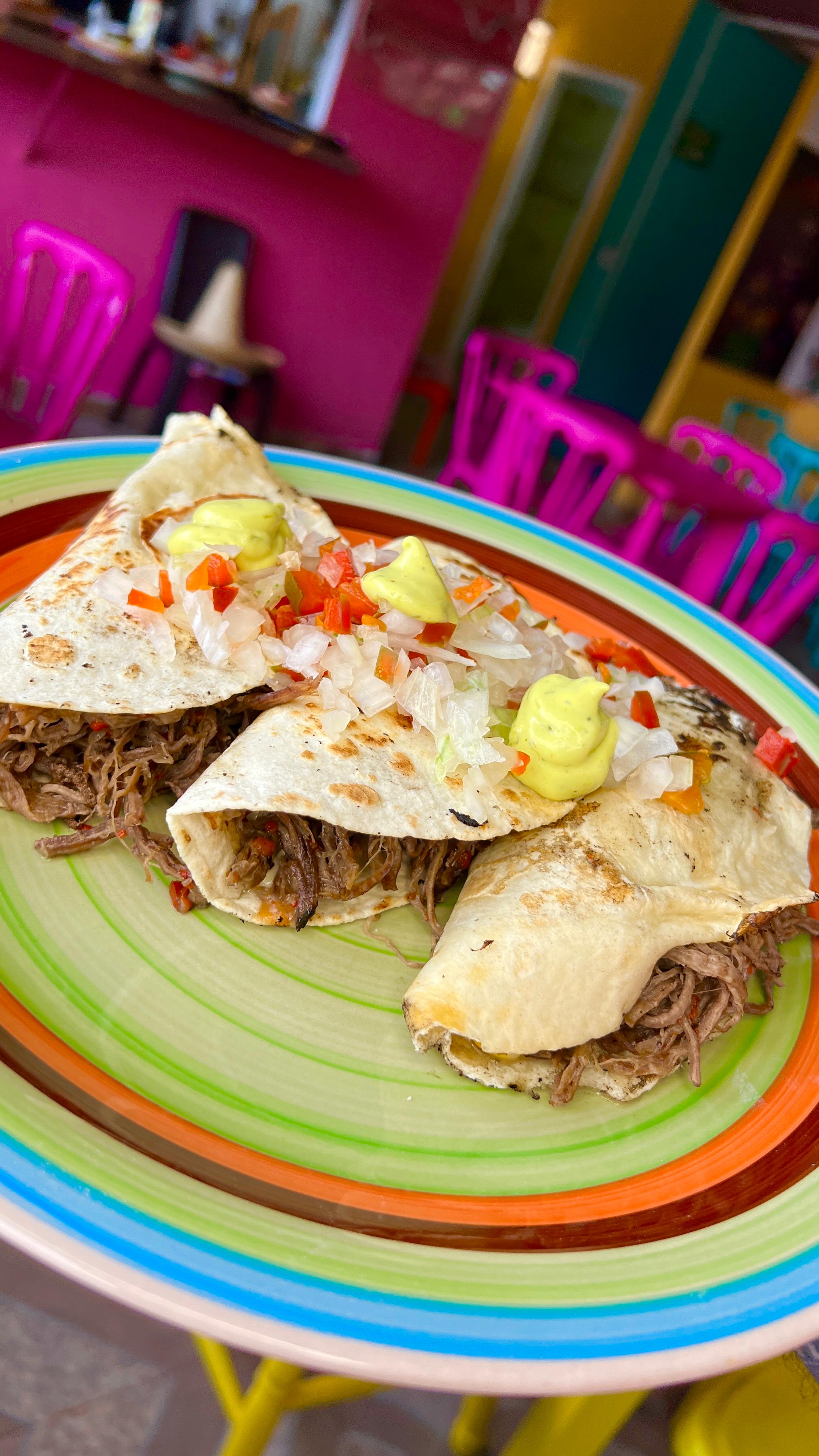 Tortilla de maíz rellena de birria, pico de gallo, queso, cilantro.
