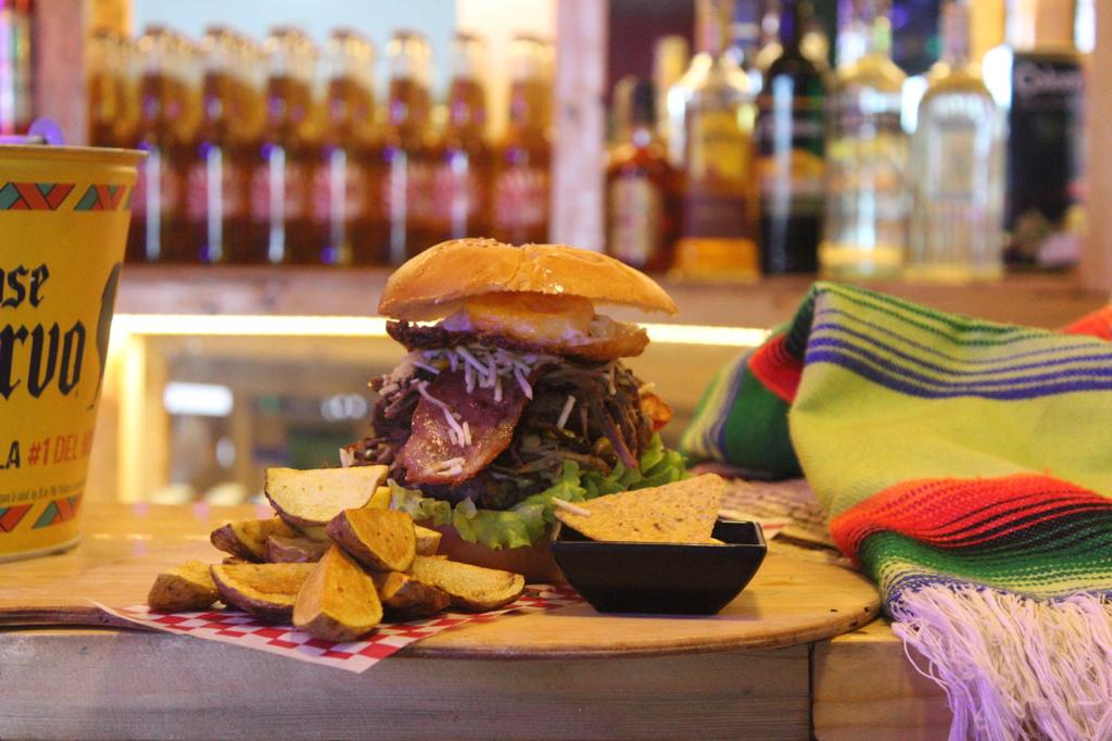 Pan, doble carne, pollo desmechado, huevo, maíz, ripio de papa, tocineta, queso, tomate, lechuga, cebolla.