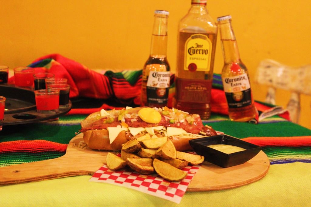 Pan, salchicha, carne y pollo desmechado, maíz, cebolla, tocineta, queso, ripio de papa, salsa de la casa.
