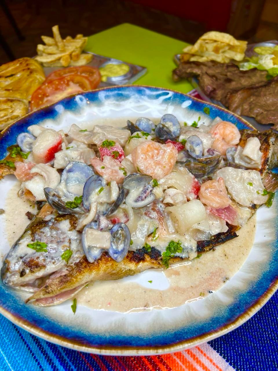 Papa criolla, costillas de cerdo, salchicha, queso, salsa de la casa.