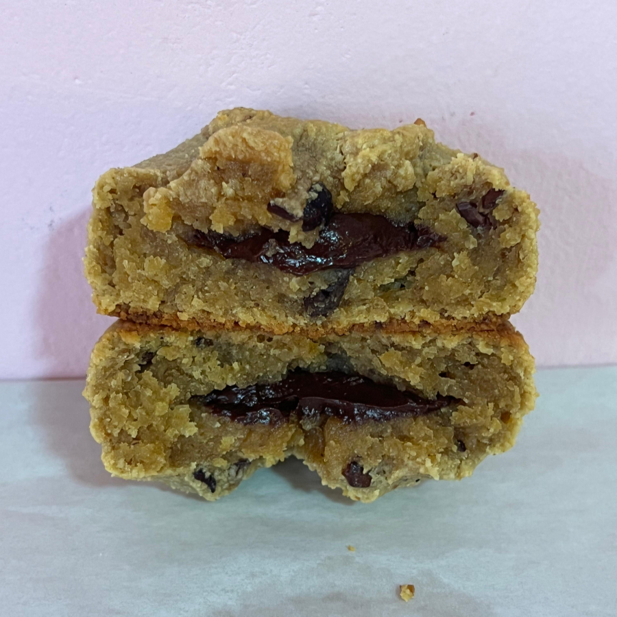 Galleta de banano con nibs de cacao y relleno de cacao 100%. Una versión saludable con aporte de proteína, grasas saludables, sin azúcar añadida, ideal para un antojo sin culpas. Apta para diabéticos.