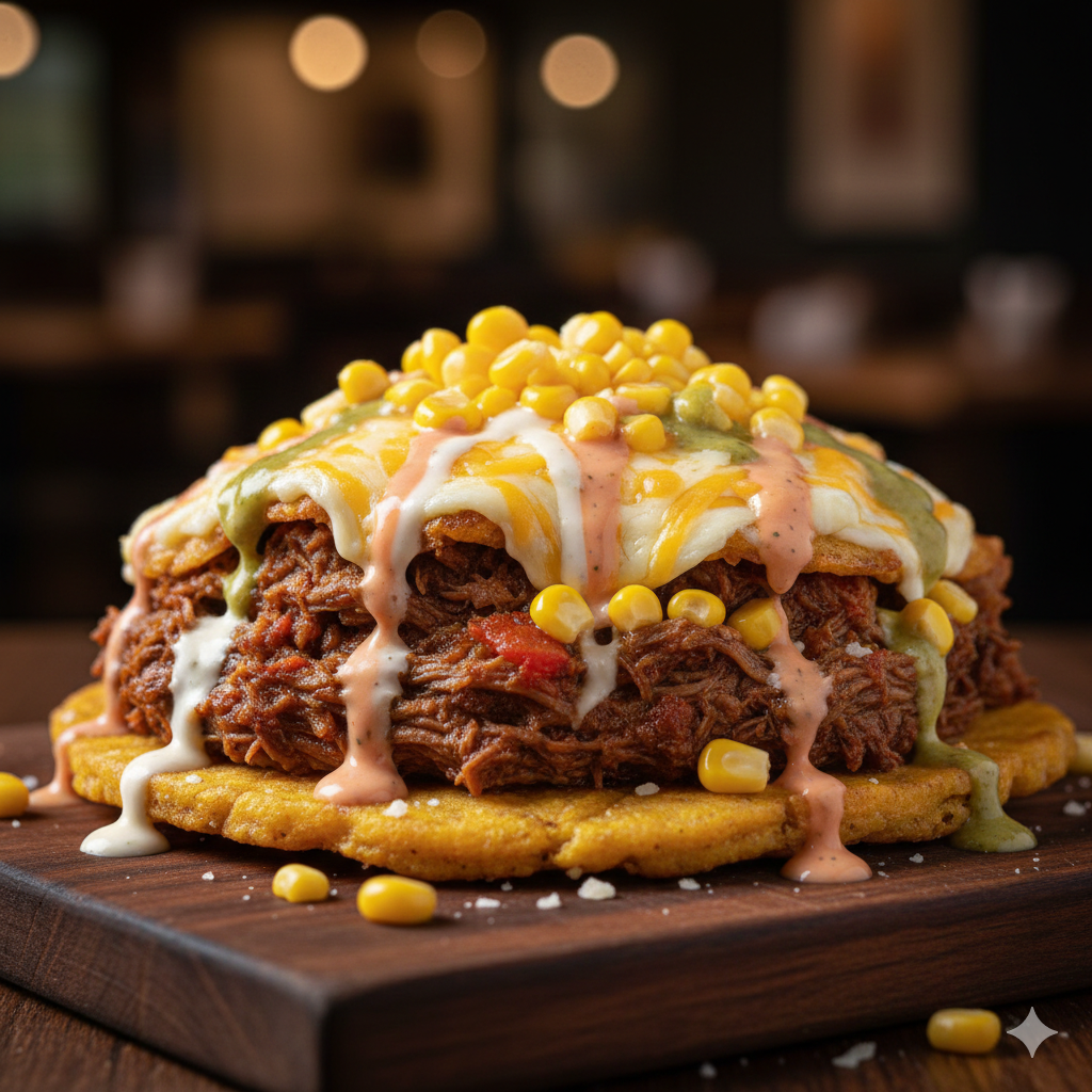 Tostada de plátano, carne desmechada con guiso, salsas de la casa, queso gratinado con maicitos.