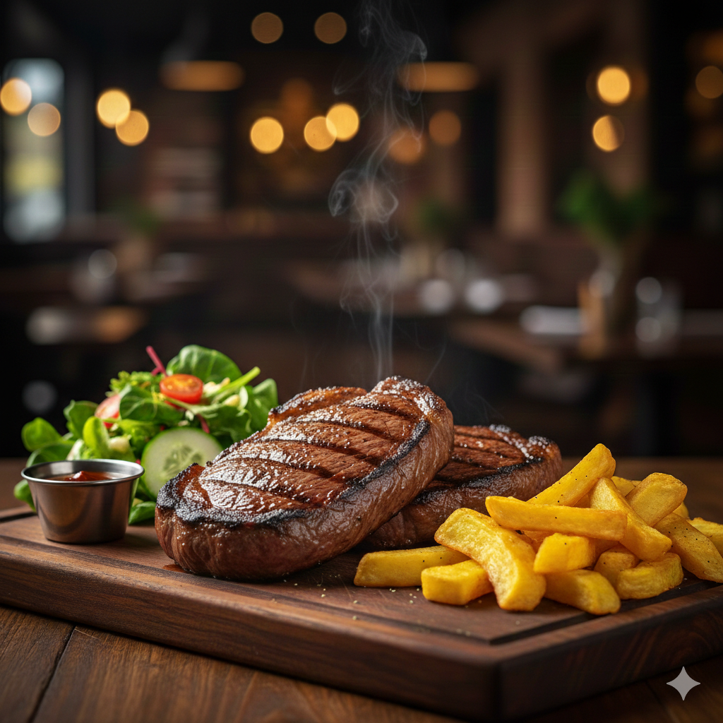 Carne asada, ensalada de la casa, papa amarilla frita.
