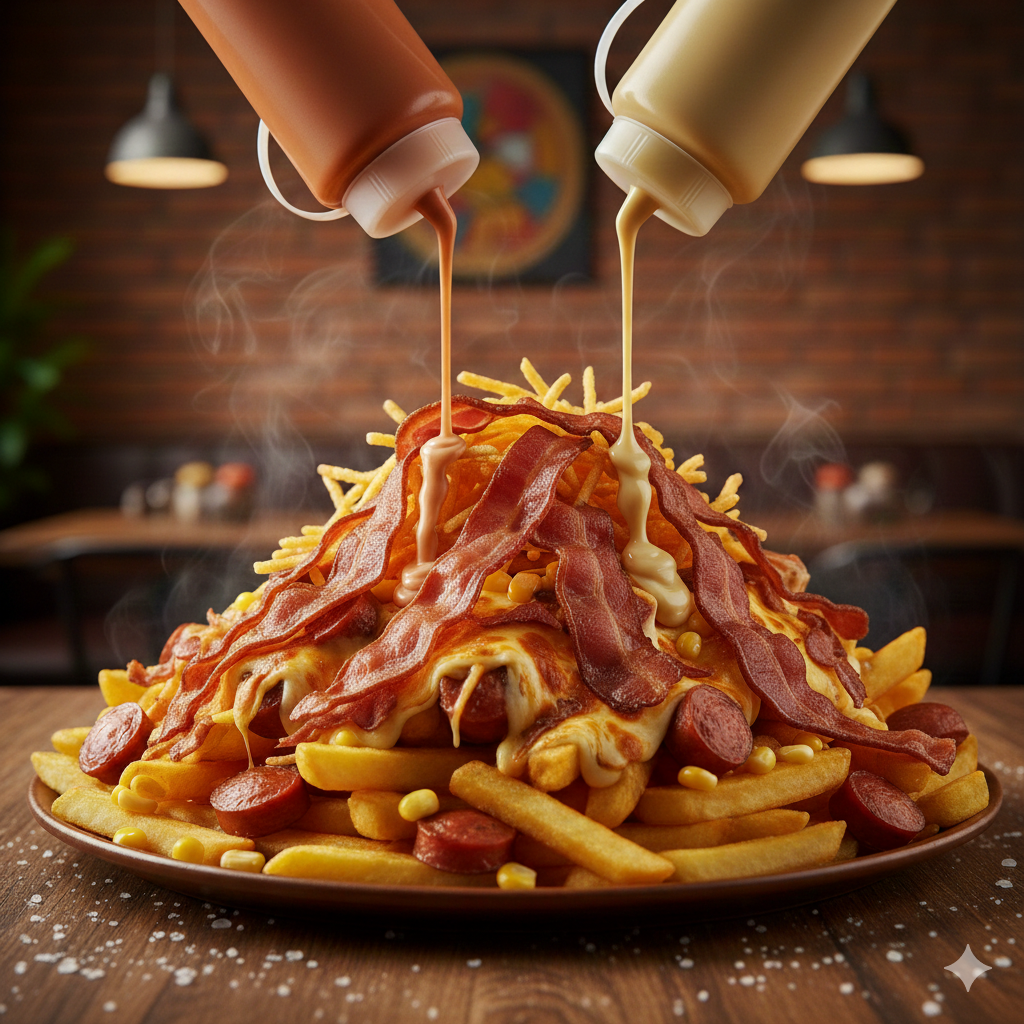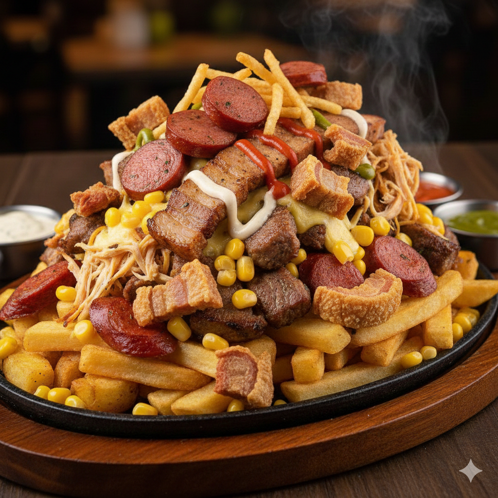 Papa amarilla, papa a la francesa, salchicha, trozos de carne de cerdo, trozos de costilla ahumada, chorizo, tocineta, pollo desmechado, ripio de papa, salsas de la casa, queso gratinado con maicitos.