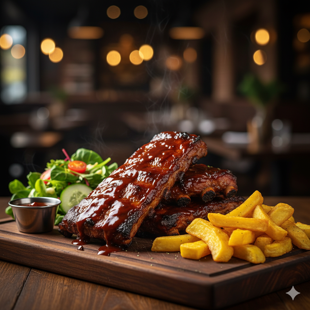 Costilla ahumada con salsa BBQ, ensalada de la casa, papa amarilla frita.