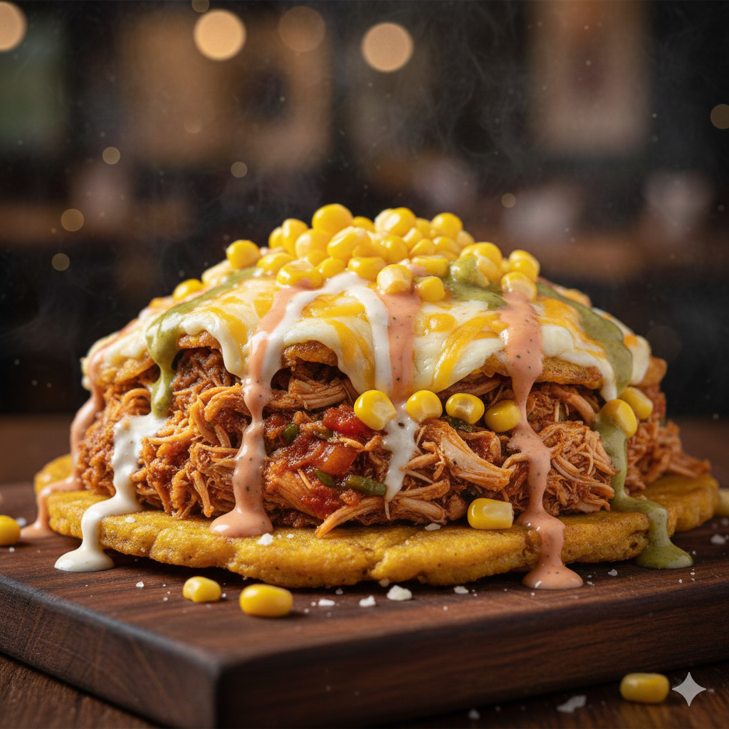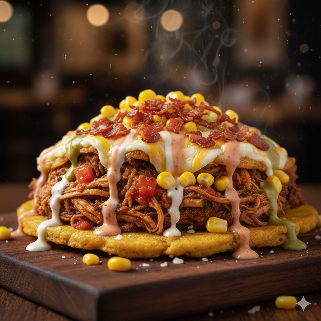 Tostada de plátano, pollo desmechado, carne desmechada con guiso, tocineta, salsas de la casa, queso gratinado con maicitos.