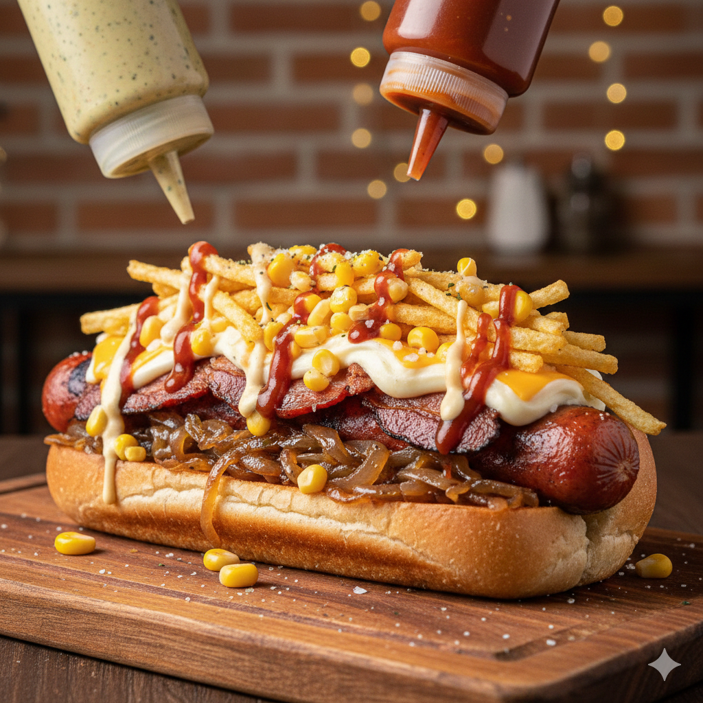 Pan, doble salchicha, cebolla caramelizada, tocineta, ripio de papa, pollo desmechado, salsas de la casa, queso gratinado con maicitos.