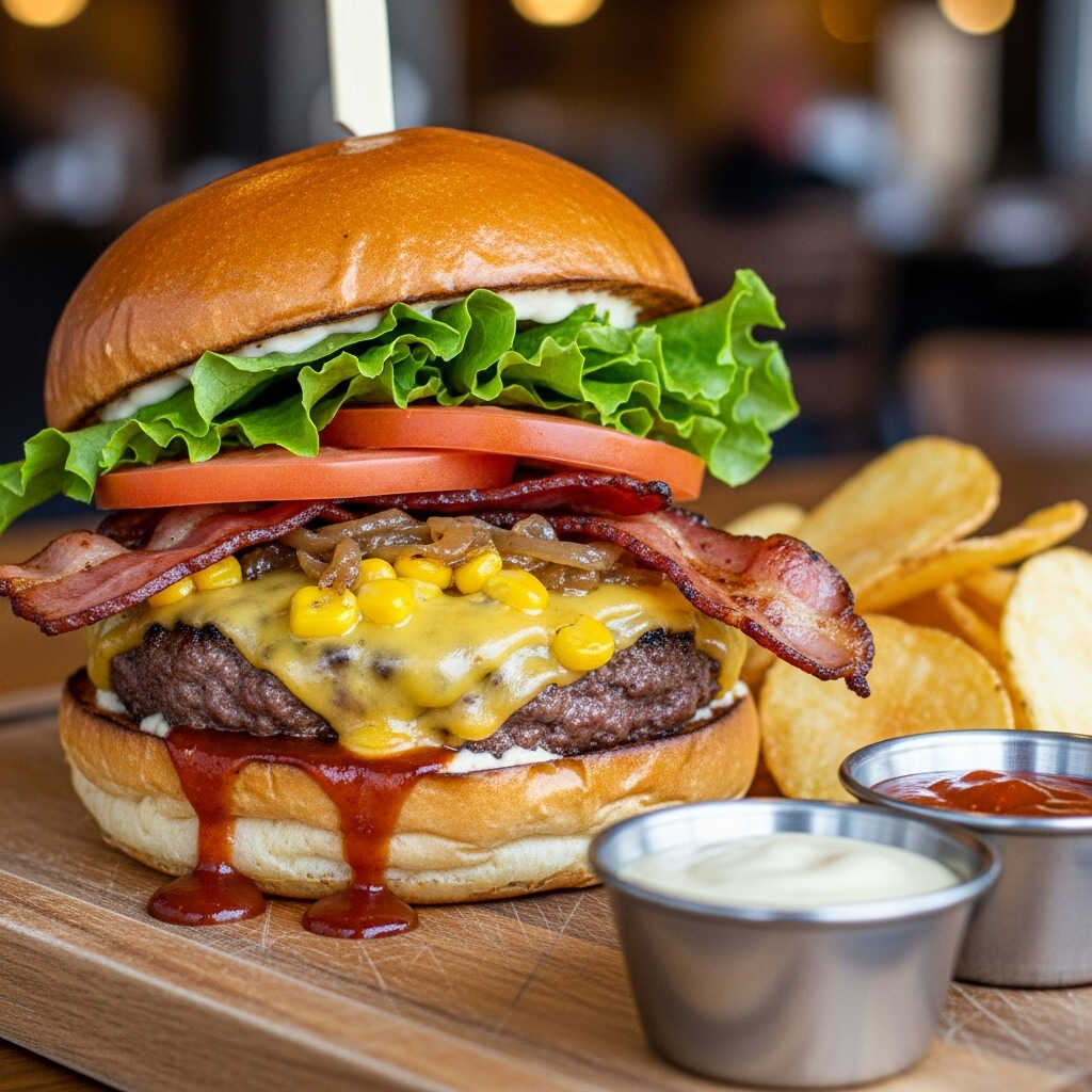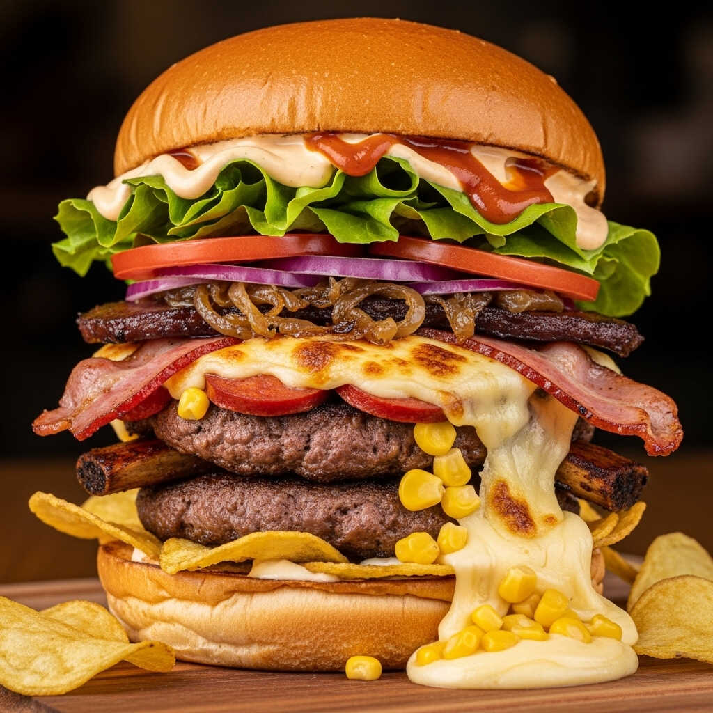 Pan, carne artesanal, cebolla caramelizada, tomate, lechuga, doble tocineta, ripio de papa, salsas de la casa, queso gratinado con maicitos.