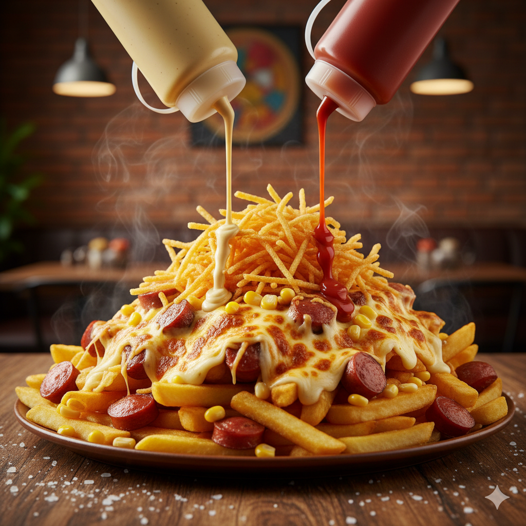 Papa amarilla, papa a la francesa, salchicha, ripio de papa, salsas de la casa, queso gratinado con maicitos.