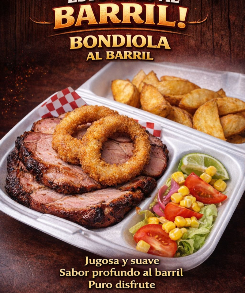 Bondiola tierna y jugosa, ahumada lentamente para un sabor intenso, acompañada de papas en casco doradas y ensalada fresca. plato completo que combina textura, aroma y frescura en cada bocado
