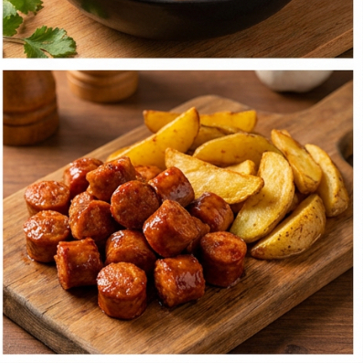 Chorizo jugoso y ahumado al barril, glaseados con nuestra salsa bbq casera de un sabor intenso, ligeramente dulce y ahumado, acompañado de papas en casco y limón