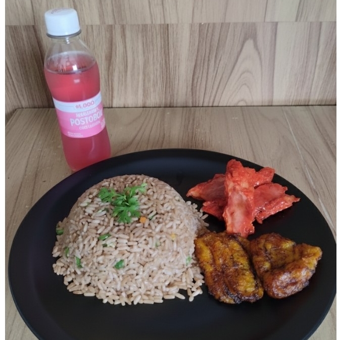 arroz con verduras(zahahoria-habichuelas)costilla ahumada(aprox 80 gramos)tajadas de platano maduro,gaseosa 250ml(porcion personal)