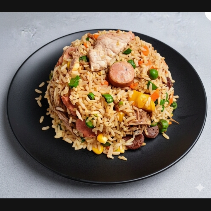 Arroz parbolizado con trozos de pollo,cerdo,tocineta,camarones, habichuelas, zanahoria,raíces chinas
