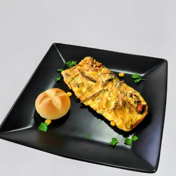 Exquisito tortilla de huevos revueltos con chorizo,maíz,maduritos,acompañado de un pan pequeño