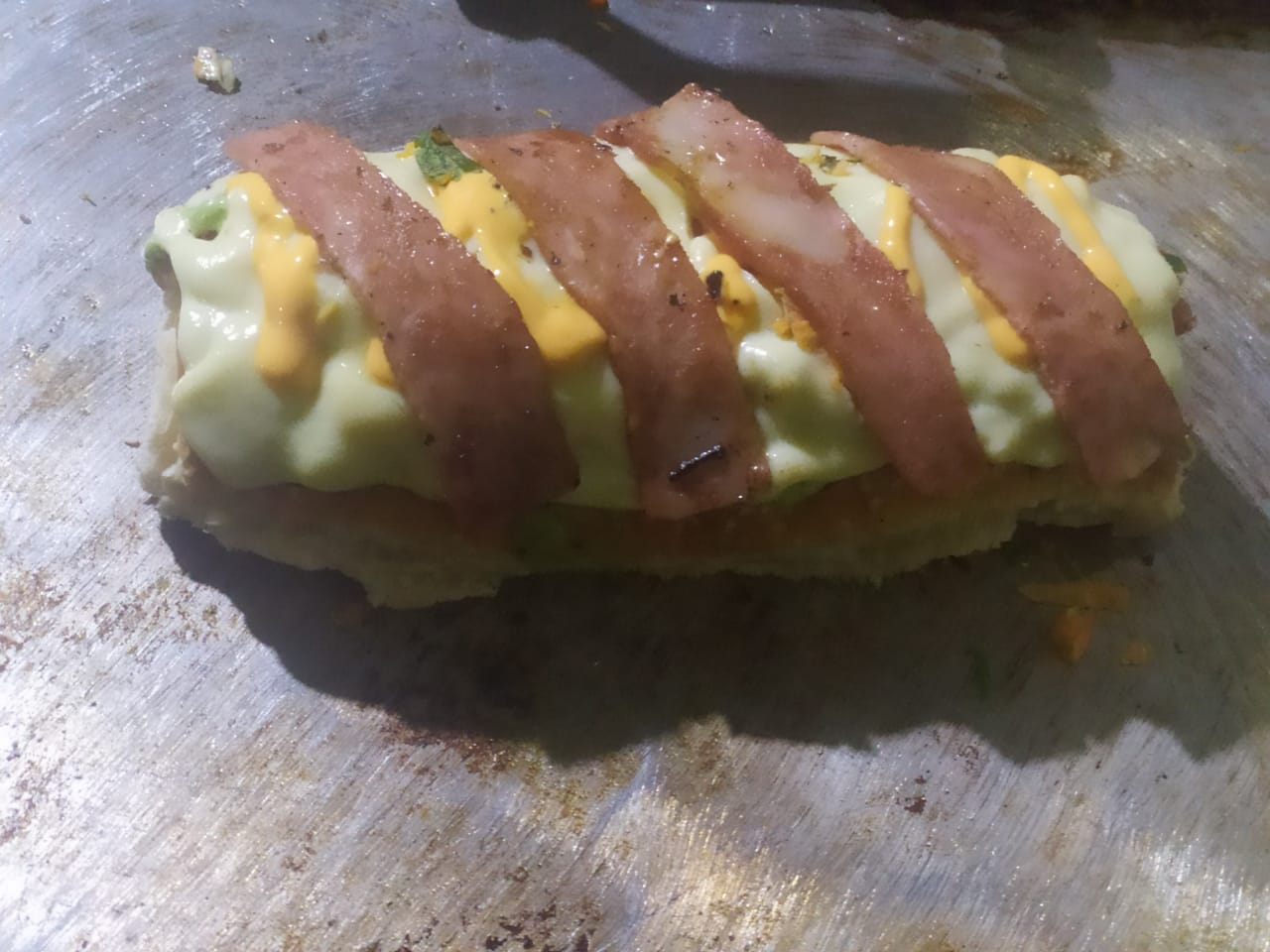 Pan, salsa de mayonesa, ajo, queso, jamón, tocineta, lechuga.