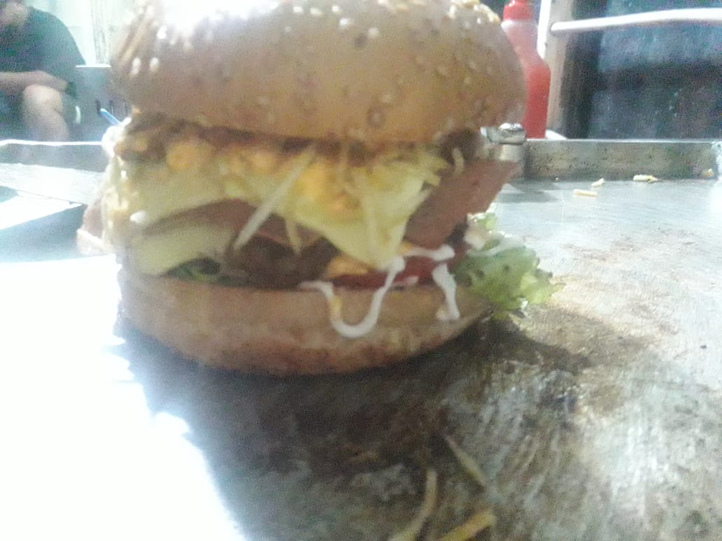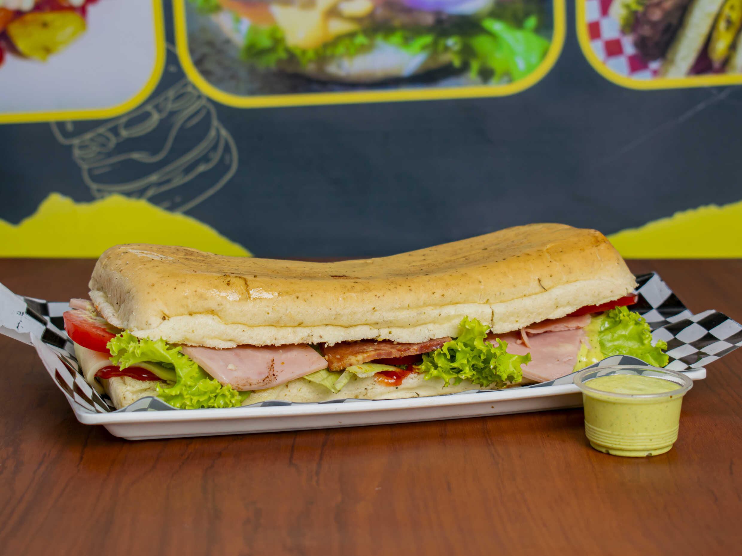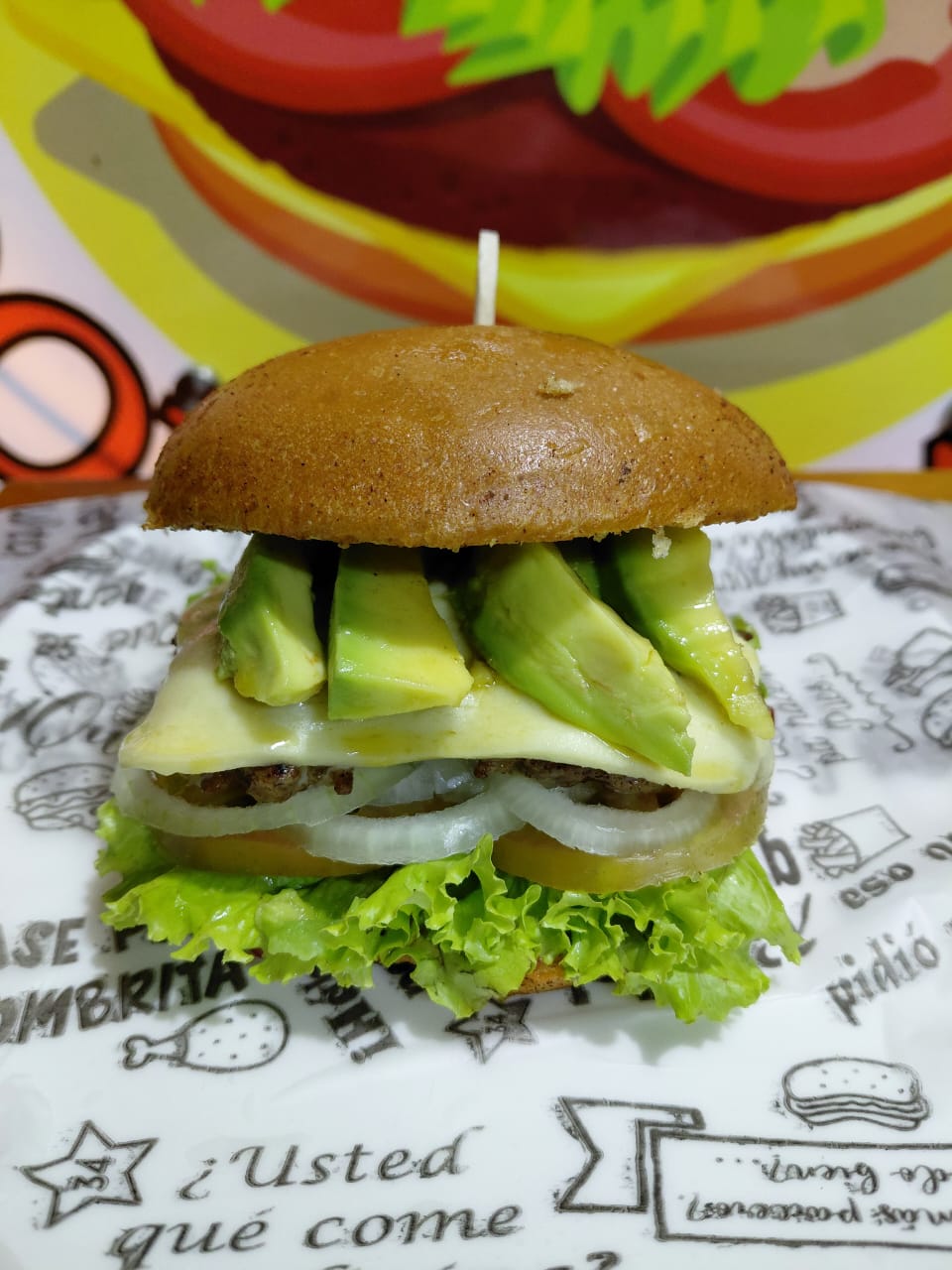 Pan artesanal, carne de hamburguesa, queso mozzarella tajado, jamón, tocineta, aguacate, huevo, lechuga, tomate, cebolla, ripio y salsas.