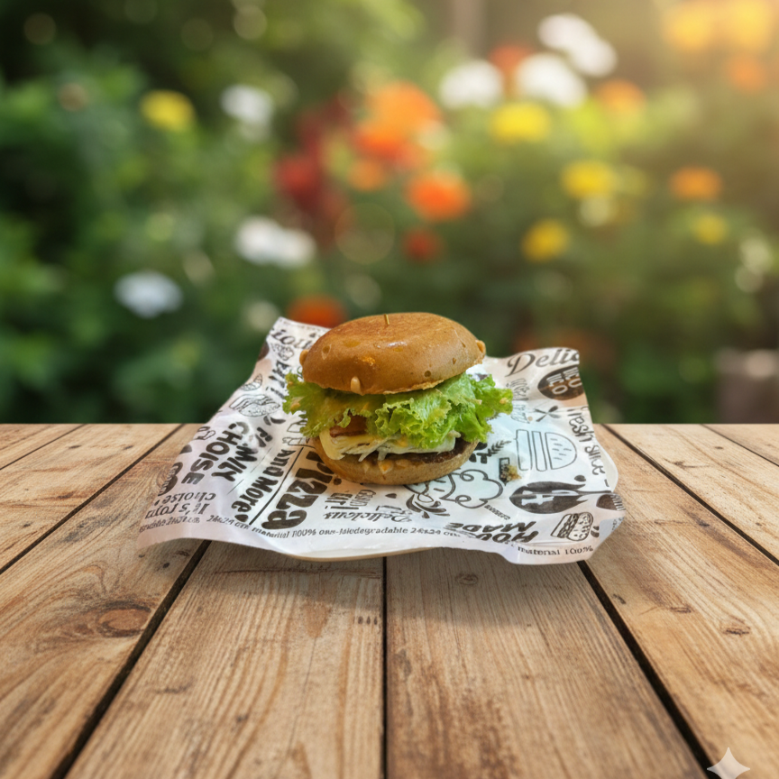 Pan artesanal, carne de hamburguesa, tomate milano, lechuga crespa, queso mozzarella y cebolla.