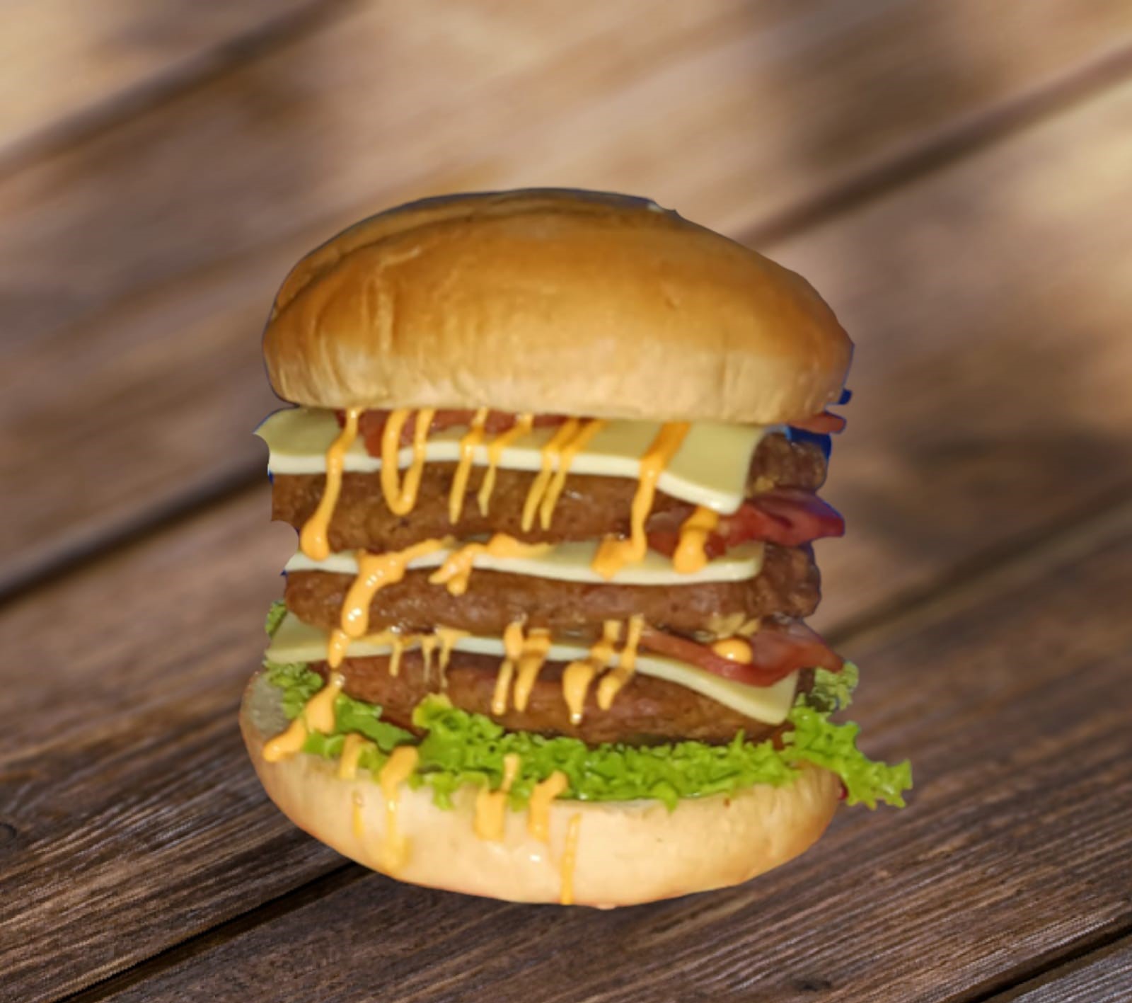 Hamburguesa Mounstruosa con pan brioche, 3 carnes de hamburguesa, 3 quesos mozzarella tajado, 3 tocinetas, lechuga, tomate. Acompañada con papa amarilla criolla.
