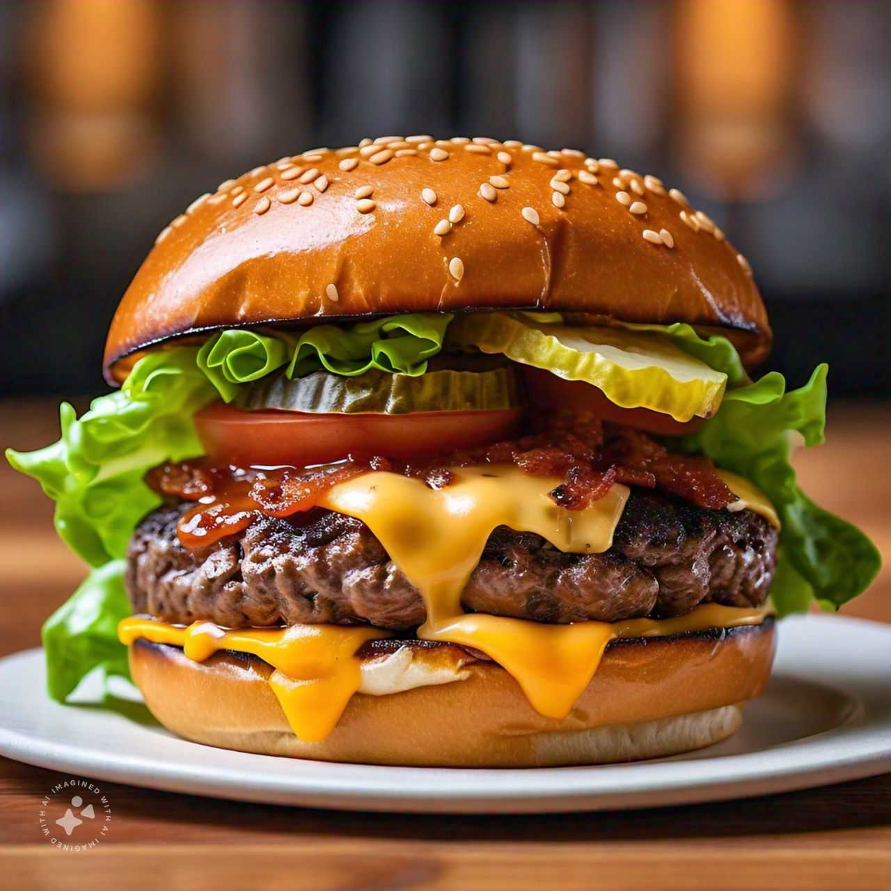 Pan brioche, carne, doble queso, lechuga crespa, cebolla, tomate, pepinillo, ripio y salsa.