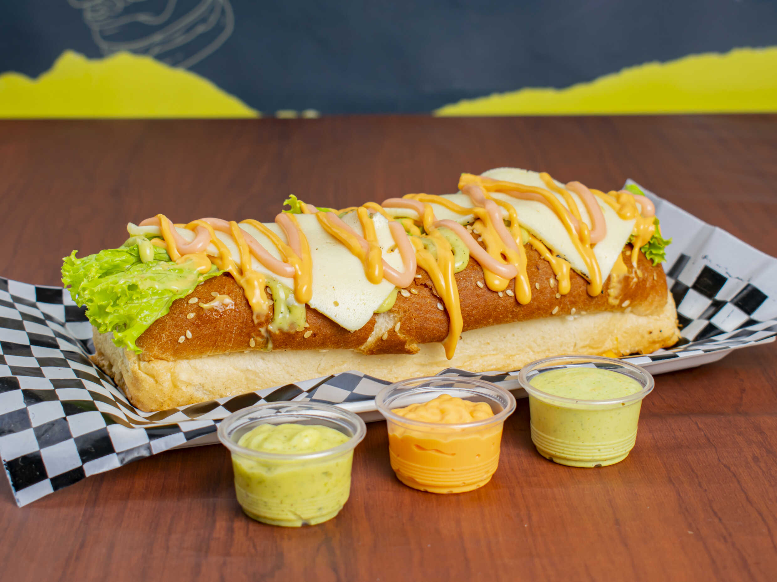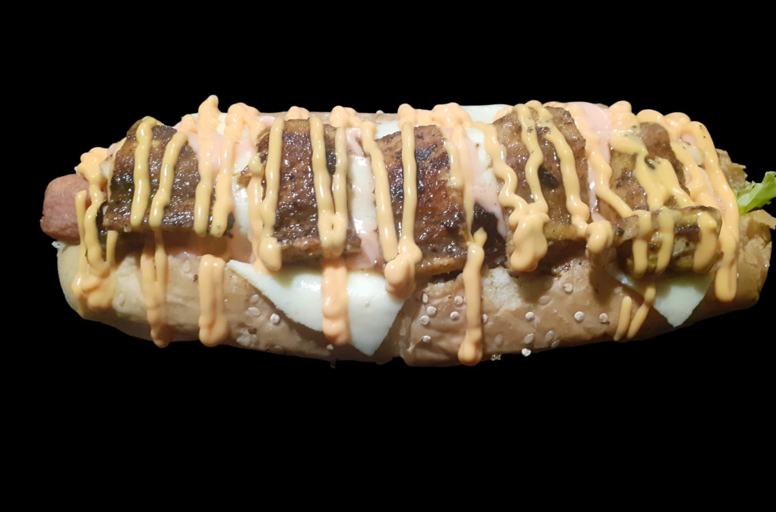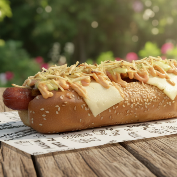 Pan artesanal, salchicha americana, cebolla caramelizada, ensalada de repollo y zanahoria, queso cheddar fundido, tocineta y ripio.