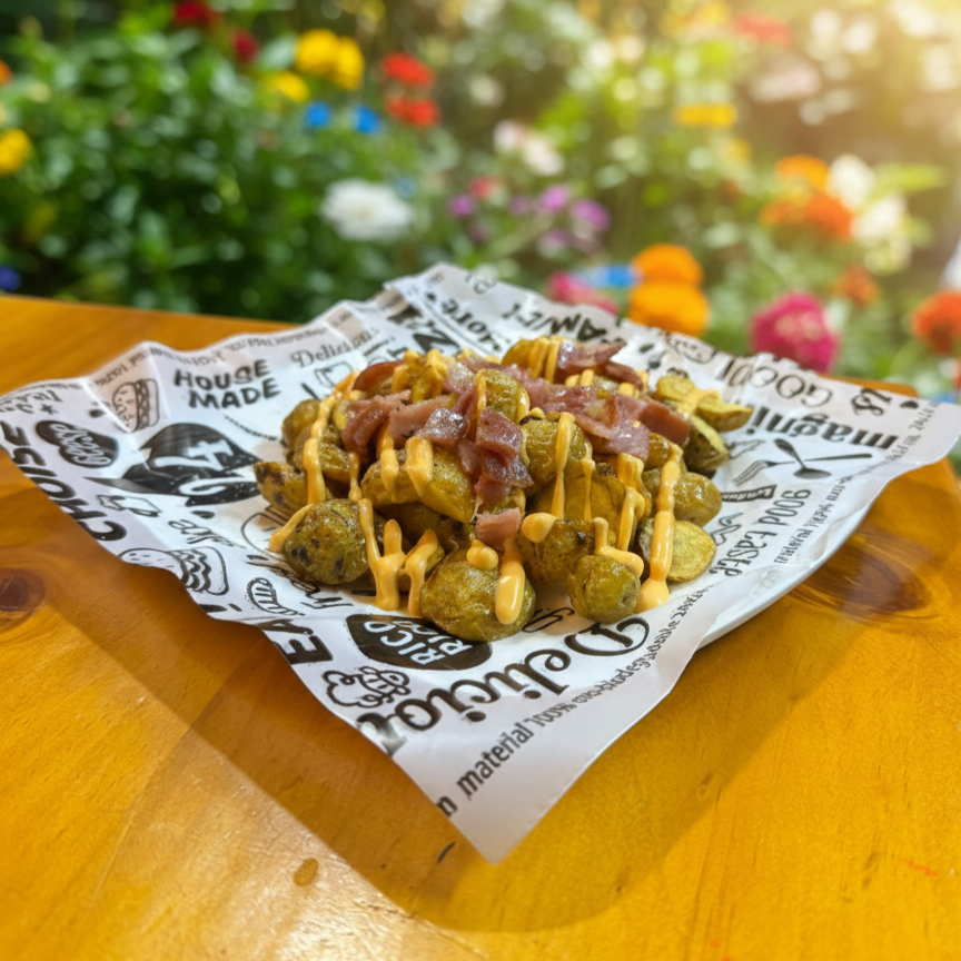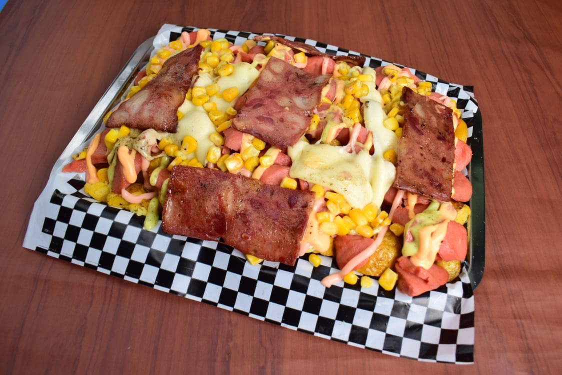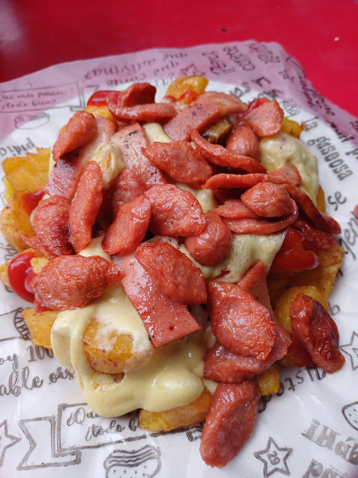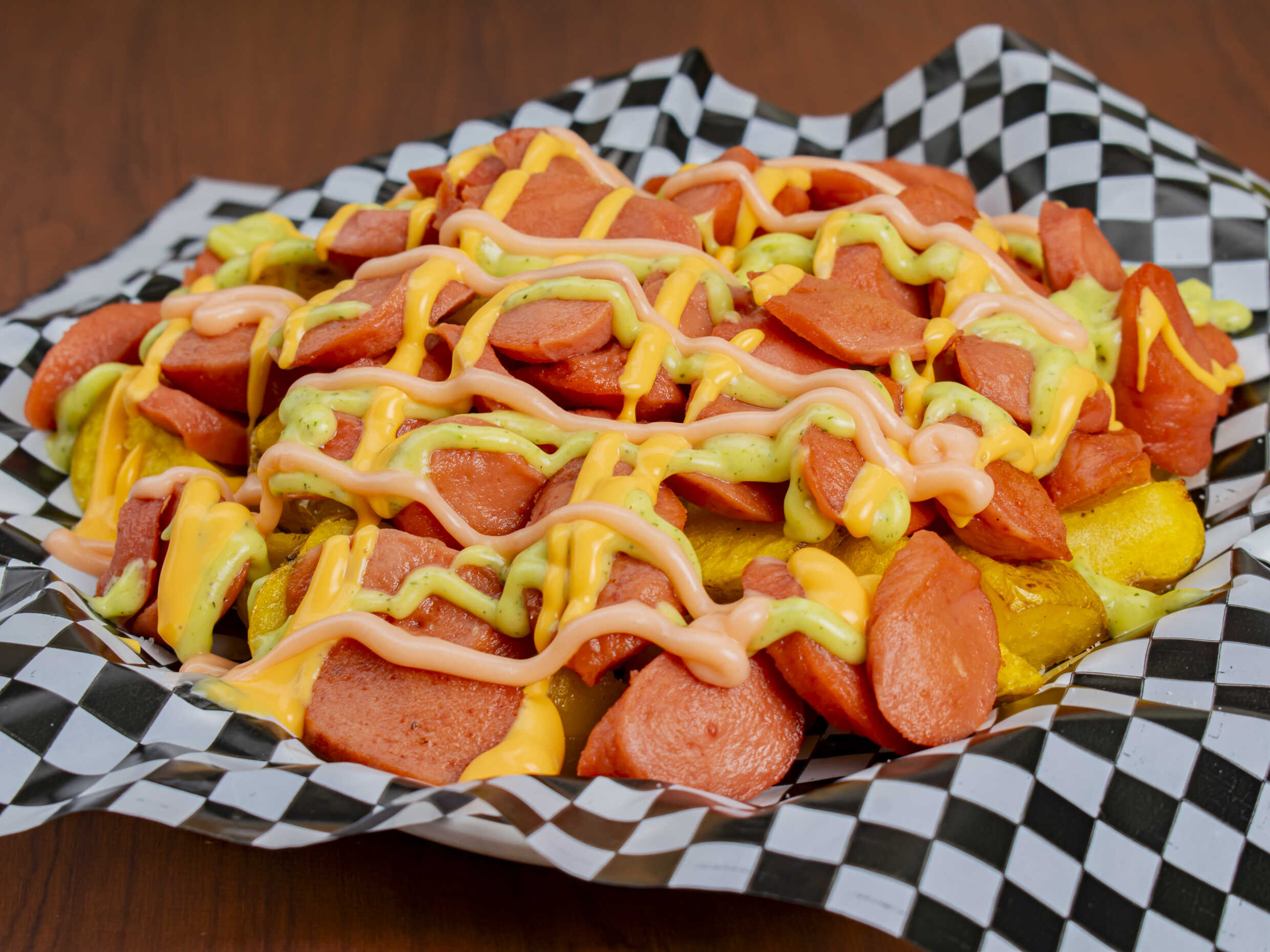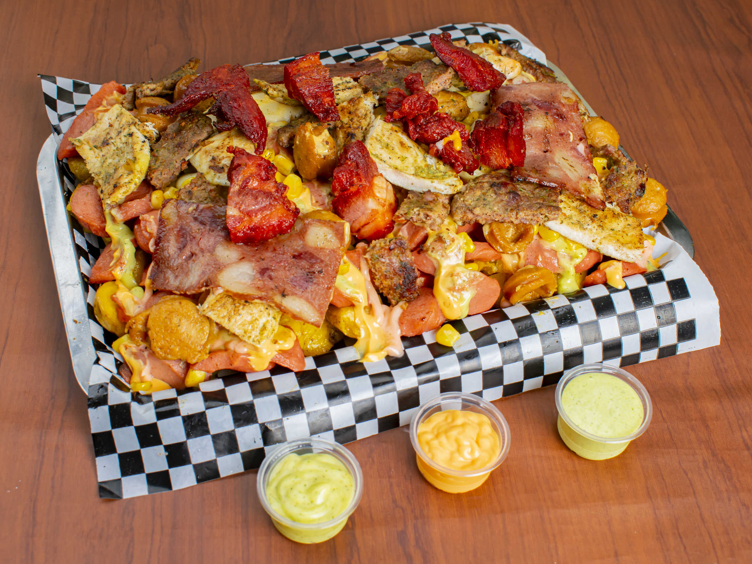 Porción para compartir servida en caja J1. Preparada con papa amarilla, salchicha, queso mozzarella, tocineta, maíz, ripio y una selección de salsas: roja, rosada, ajo y showey. (Para máx. 2 personas)