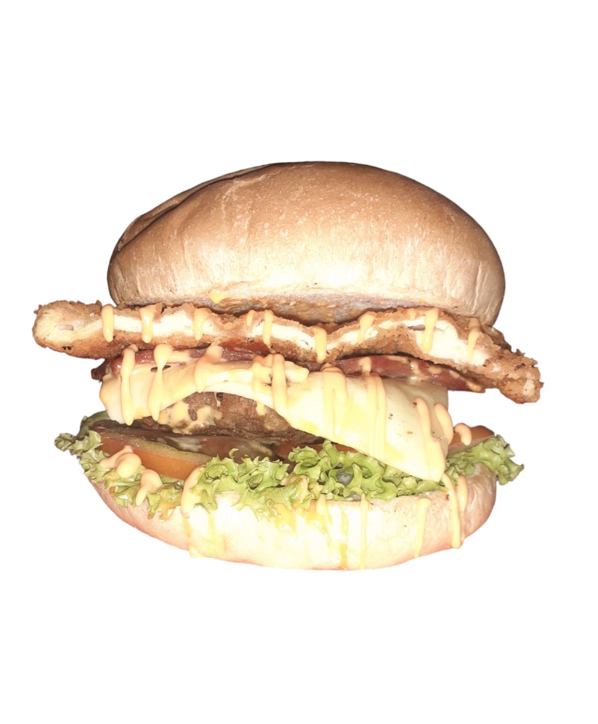 Hamburguesa Mixta con pan brioche, lechuga, tomate, carne de hamburguesa, pollo apanado, queso mozzarella tajado y tocineta.