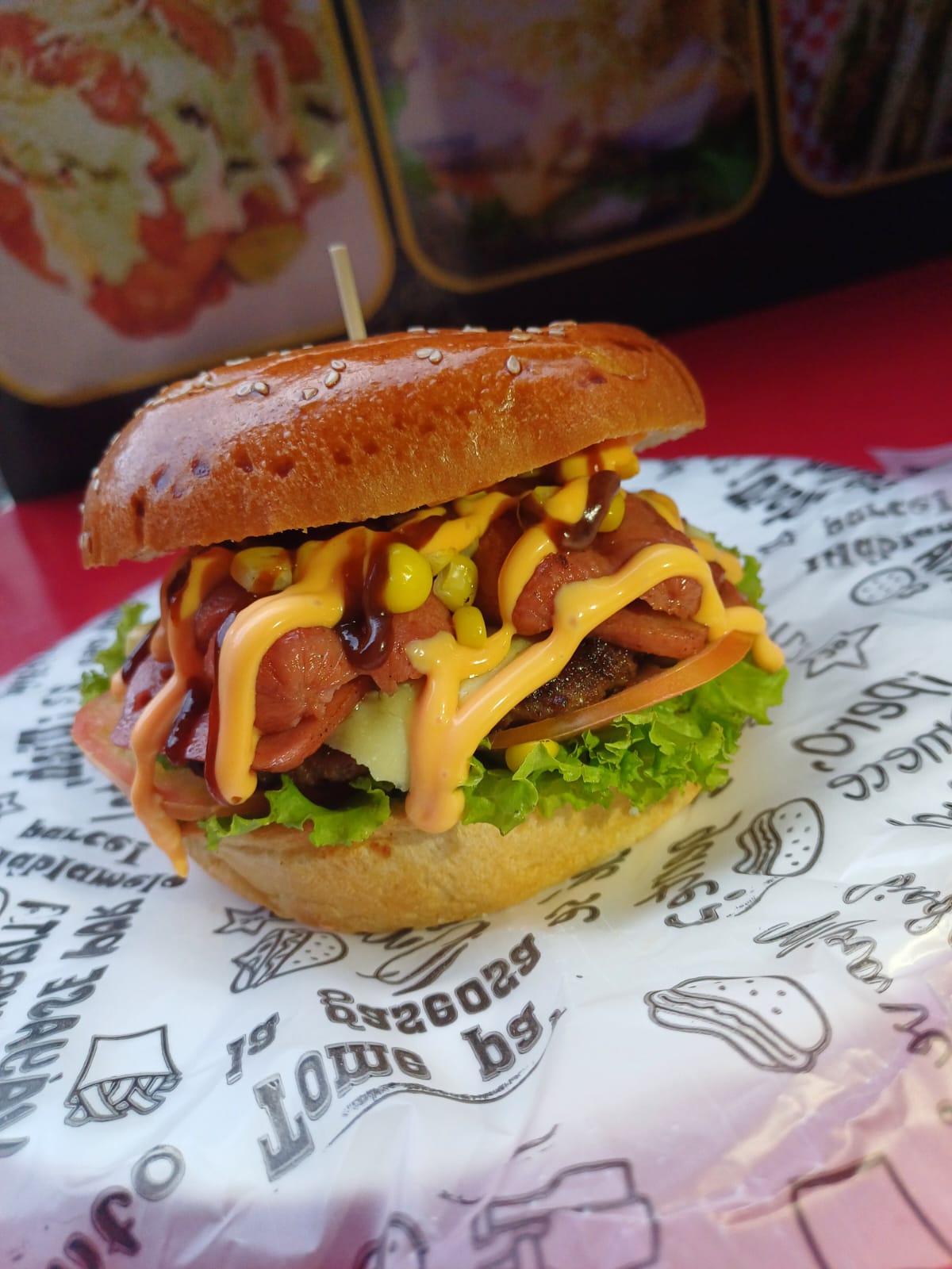 Pan brioche, carne de hamburguesa, queso, salchicha Ranchera, tocineta, lechuga, tomate y salsas.