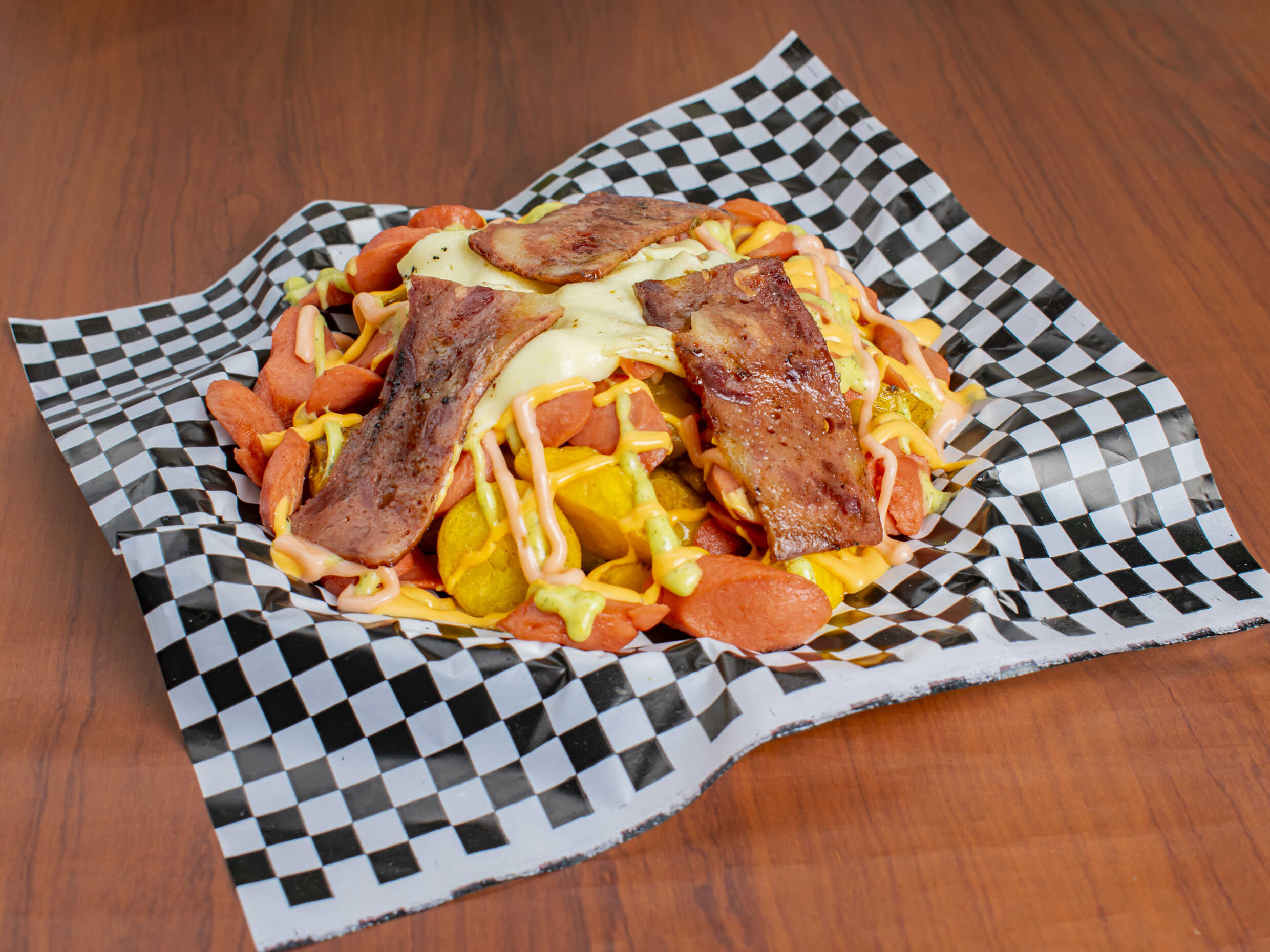 Papá, salchicha Ranchera, queso, tocineta, ripio y salsas.