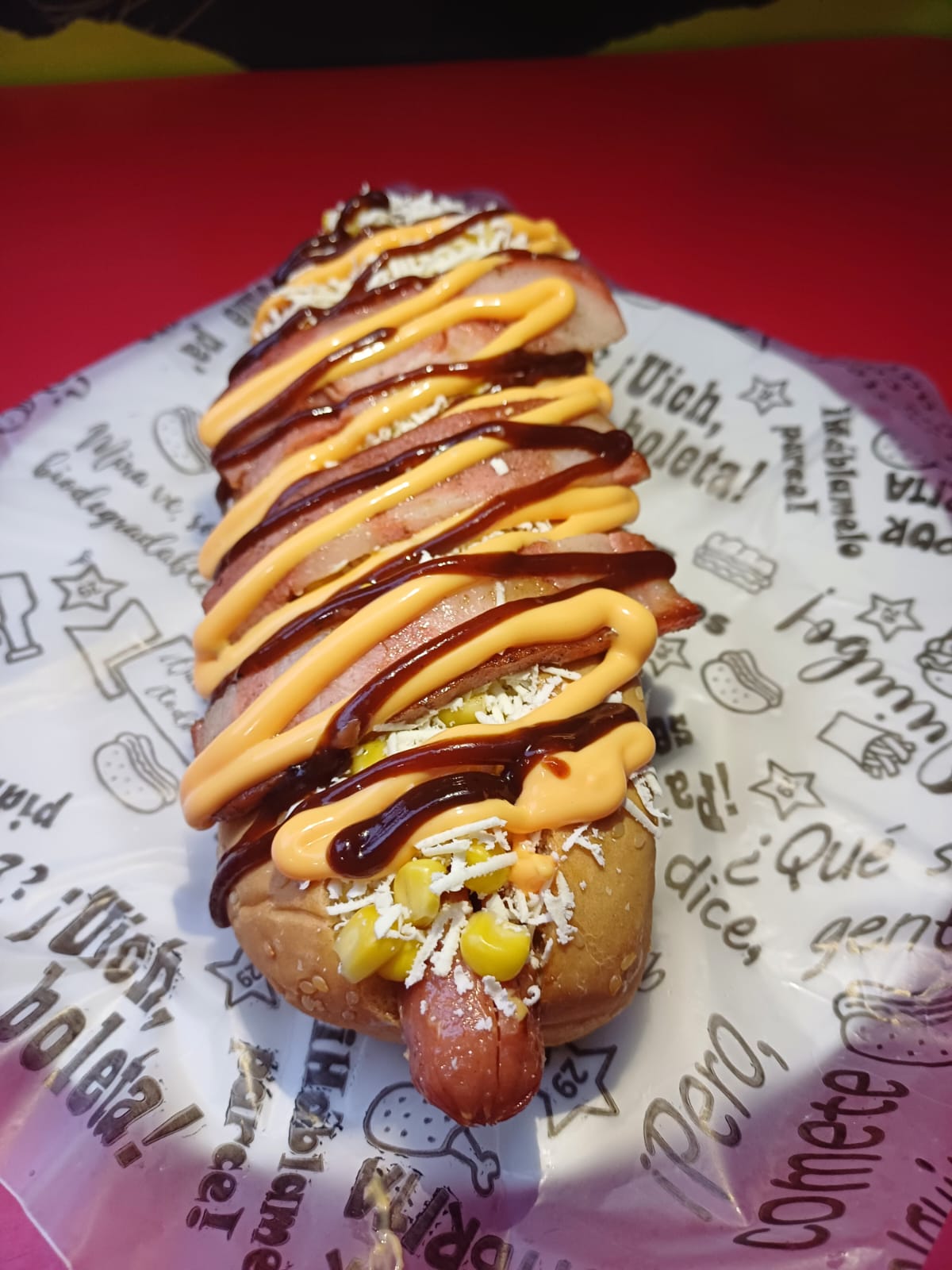 Pan, salchicha rancheras, maíz, queso costeño, tocineta, salsa BBQ y salsa cheddar.