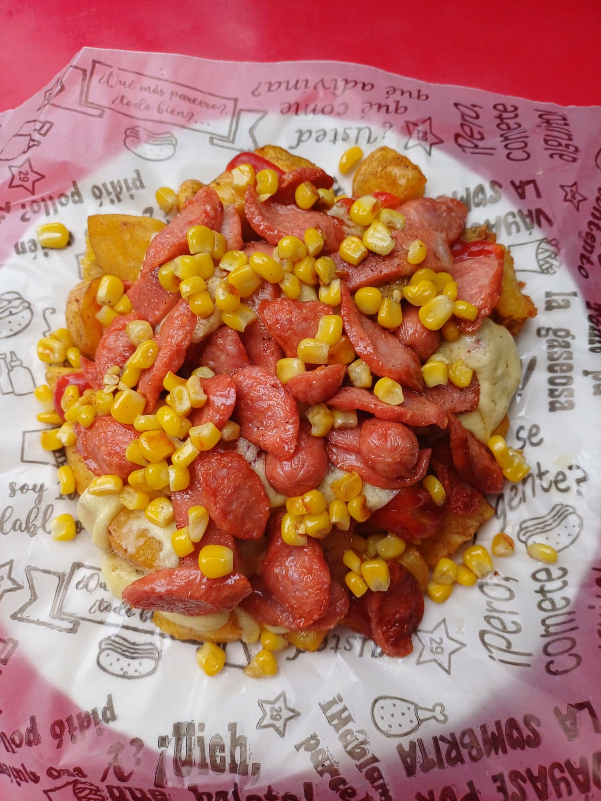 Papá, salchicha, queso, tocineta y maíz maduro.