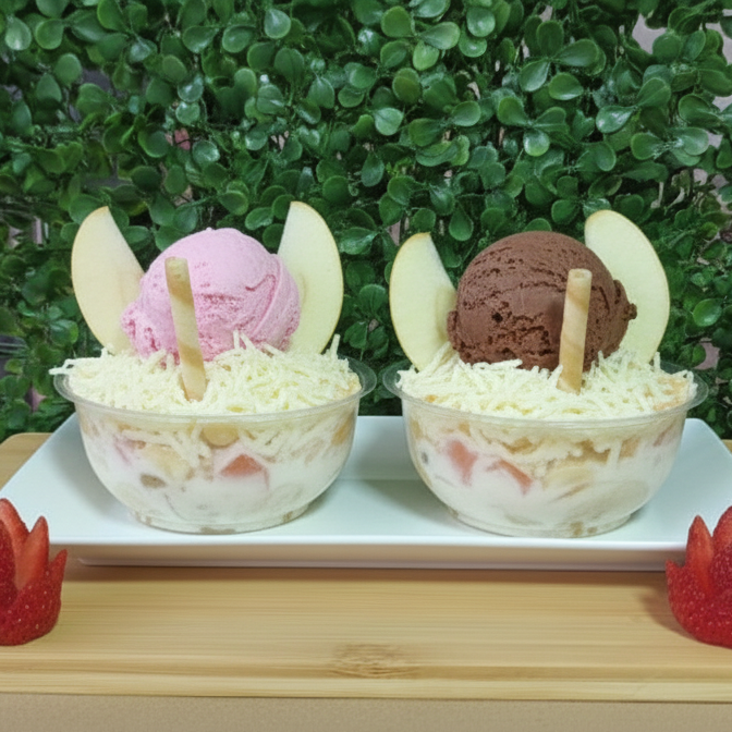 Mix de 7 frutas (mango, papaya, fresa, banano, manzana, uva, kiwi), crema de leche de la casa, queso mozzarella, leche condensada, galleta Wafer, dos bolas de helado a elección. Vaso 24 onzas.