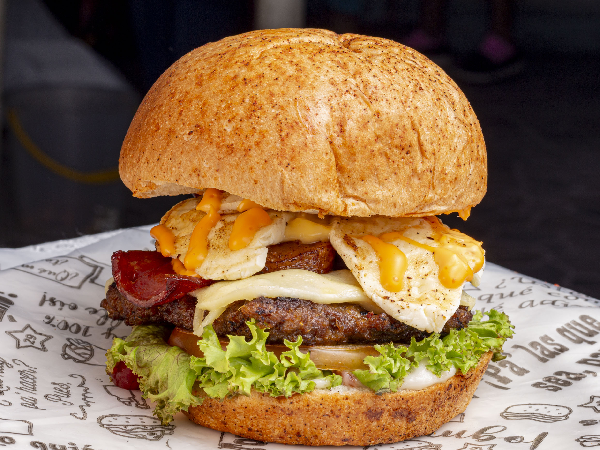 Hamburguesa Monstruosa con pan brioche, 3 carnes de hamburguesa, 3 quesos mozarella tajado, 3 tocinetas, lechuga, tomate. Acompañada con Papa Amarilla Criolla.