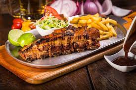 Costilla Ahumada acompañada de ensalada de lechuga, tomate, ripio de papa acompañado con papa amarilla.