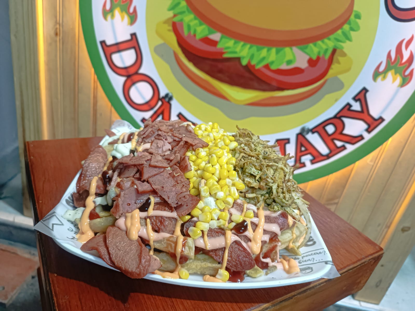 Papa, salchicha, queso mozarella, tocineta, maiz, chorizo, carne de hamburguesa, costilla, filete de pollo, ripio y salsas