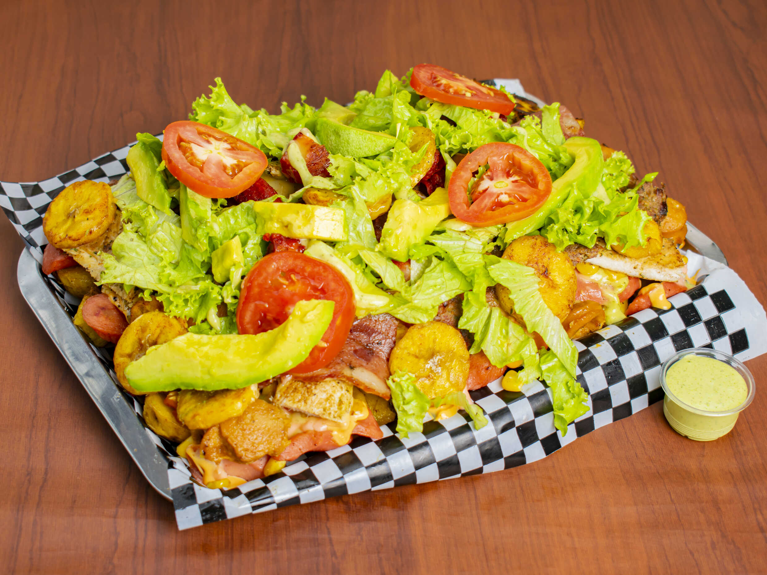 Papa, carne de res, filete de pollo, costilla, chorizo, maduro, aguacate , ensalada y salsas.