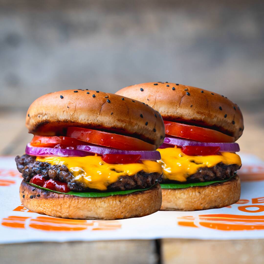 Hamburguesa con dos carnes de 200gr cada una, en pan brioche dorado con lechuga tomate y cebolla fresca, salsa Fellow y salsa de tomate.