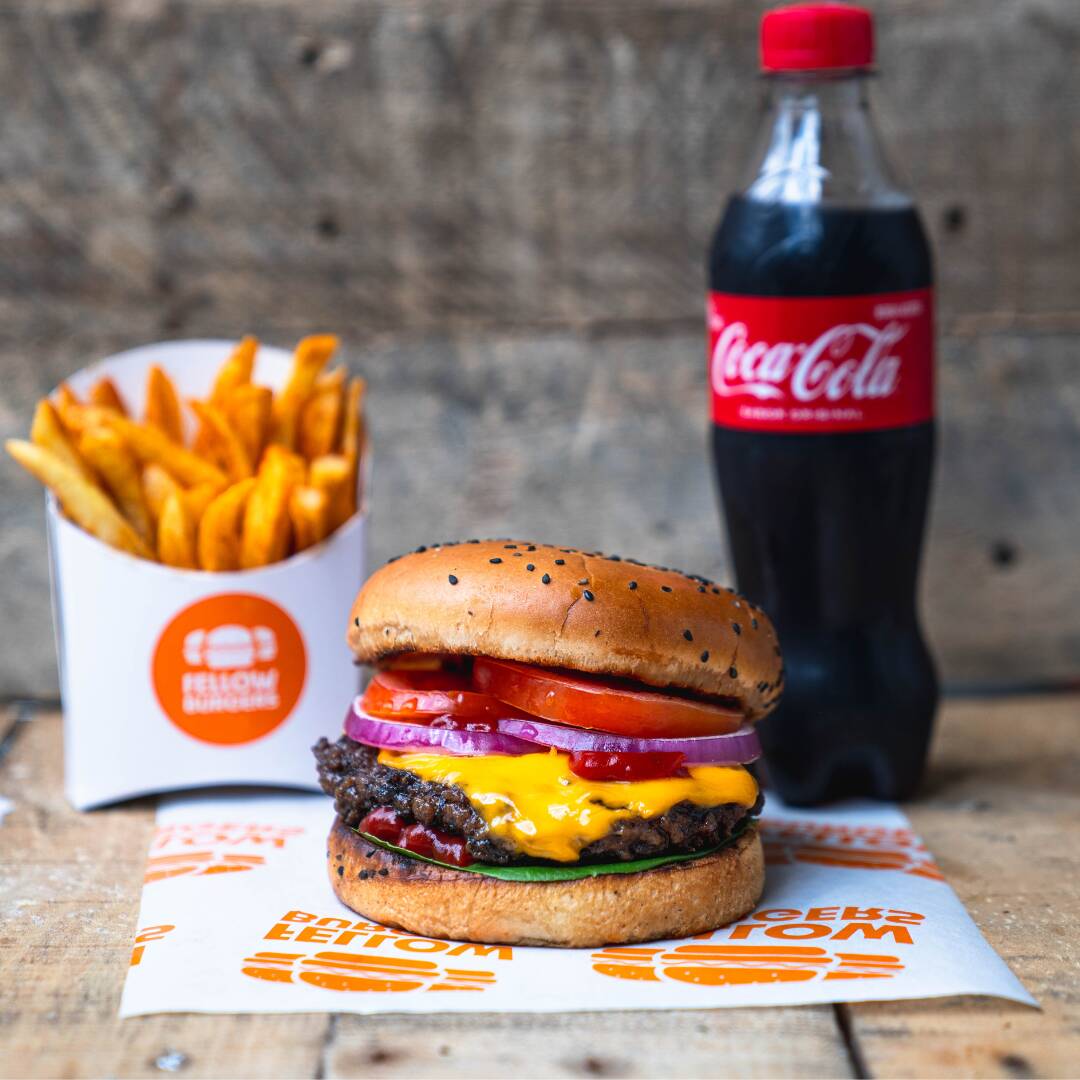 Hamburguesa Fellow, Papas fritas y bebida a elección.