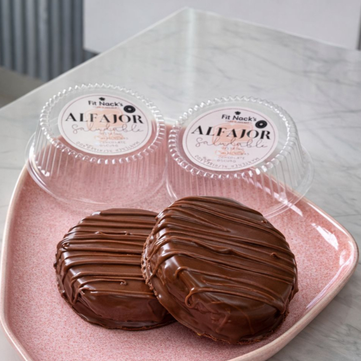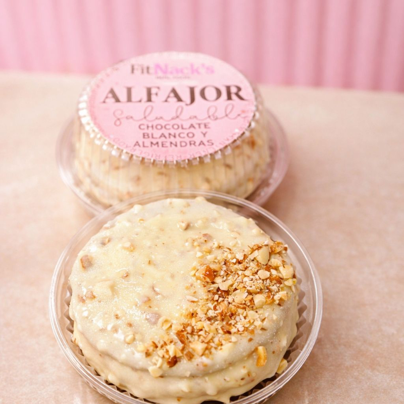 Alfajor con masa de harina de almendras y arroz integral, relleno de arequipe sin azúcar y cubierto de chocolate blanco sin azúcar.