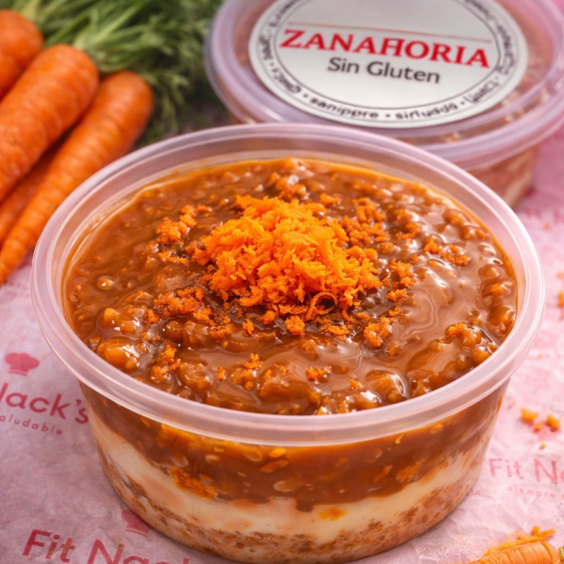 Ingredientes: huevos, harina de arroz, harina de almendra, ghee, zanahoria, vainilla, leche de almendras, stevia, canela, jengibre, nuez moscada, queso crema y arequipe sin azúcar.