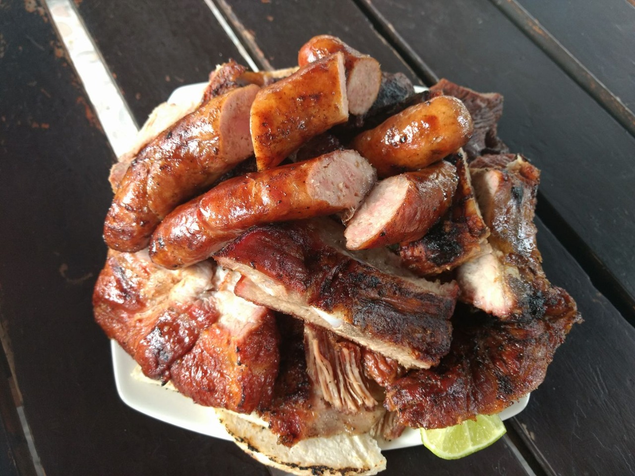 Jugosos trozos de carne a la llanera costilla y chorizo acompañado de y uva ají y guacamole