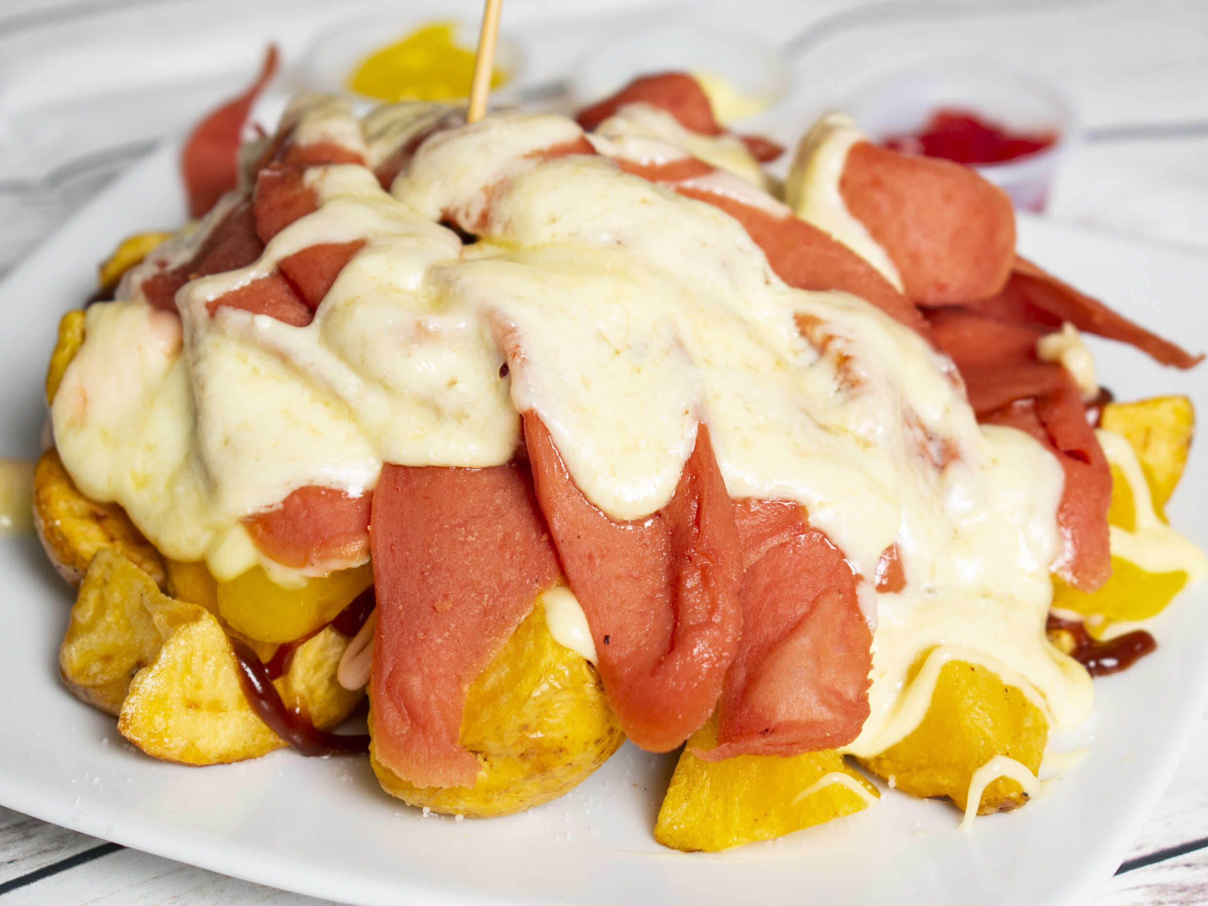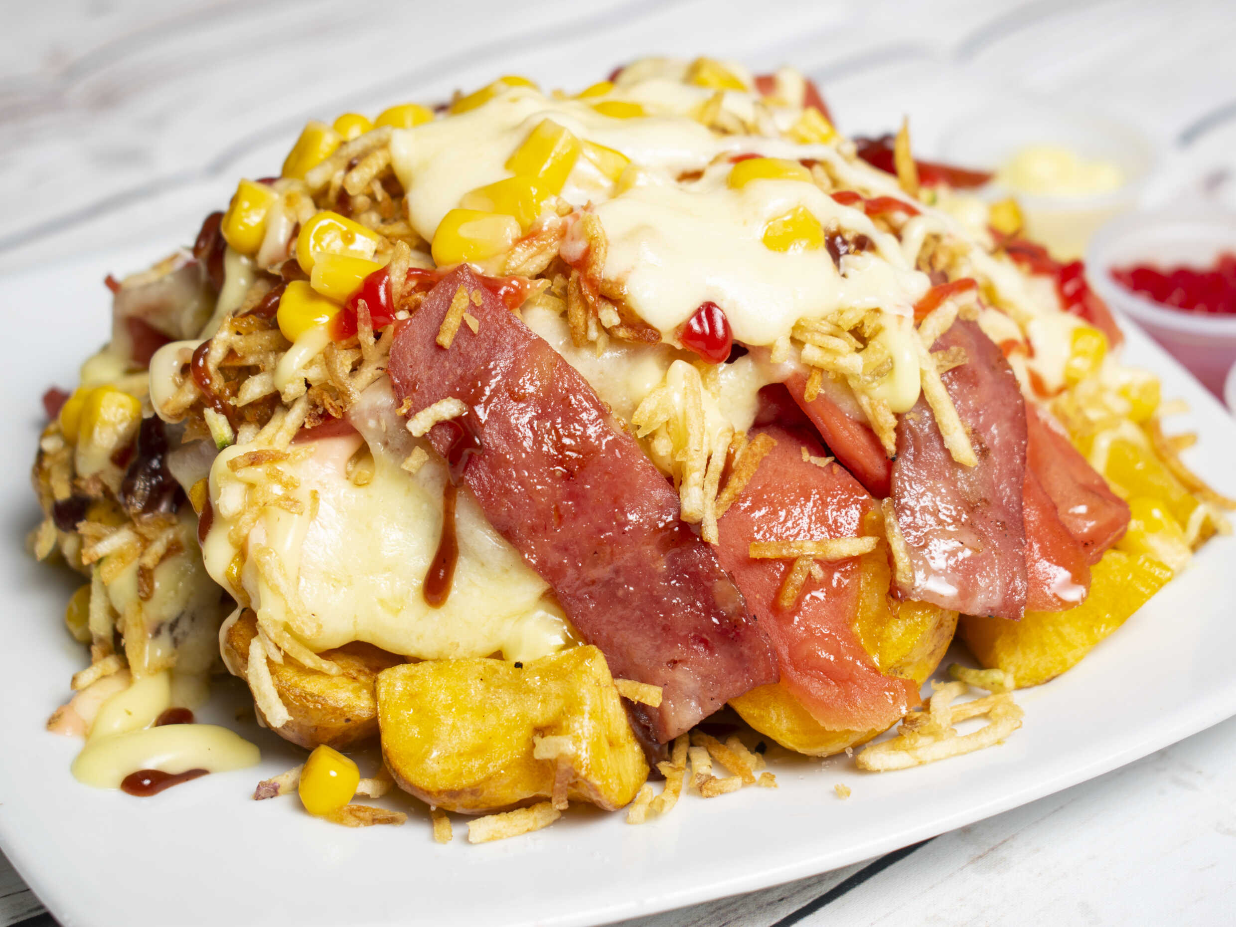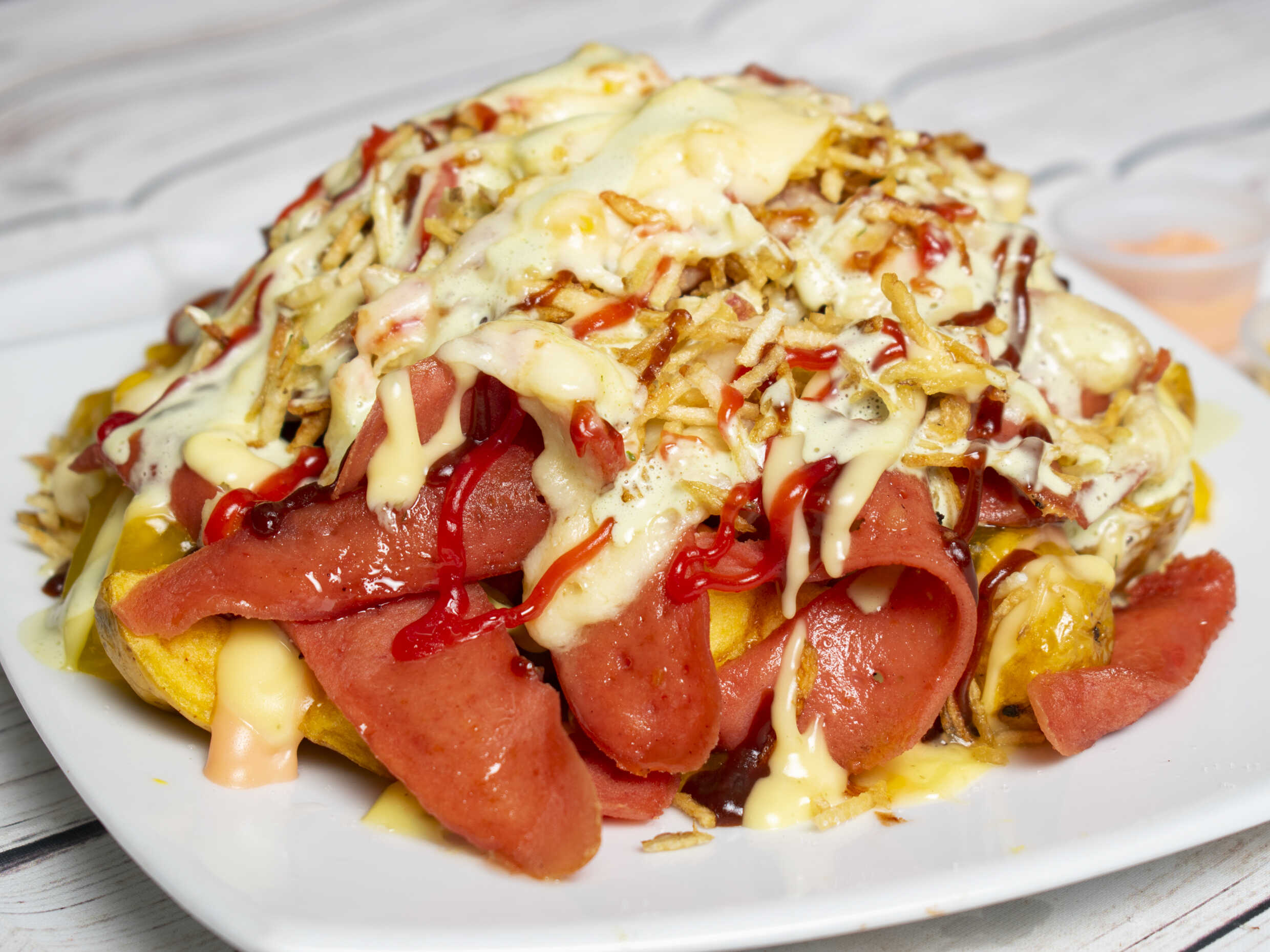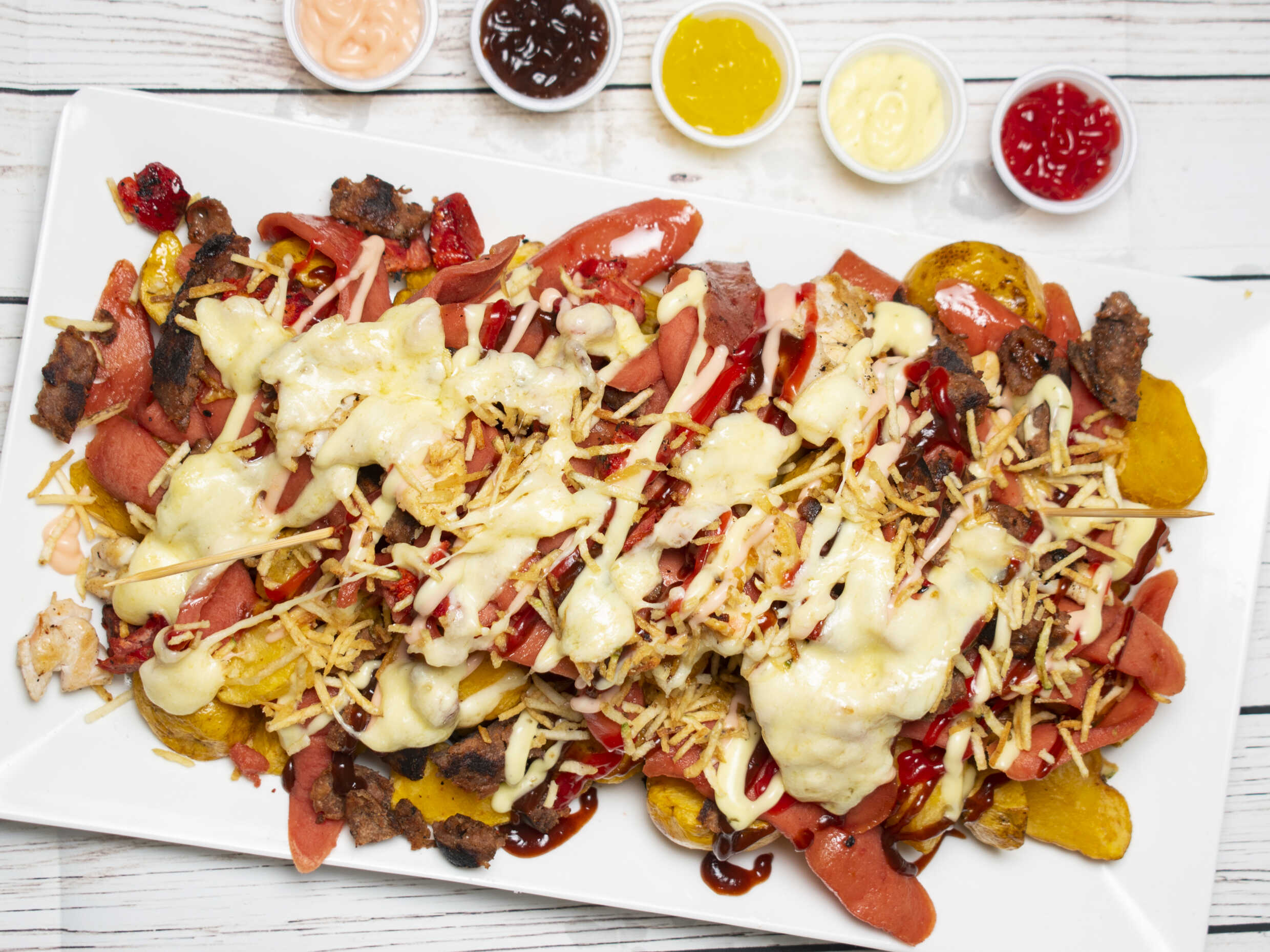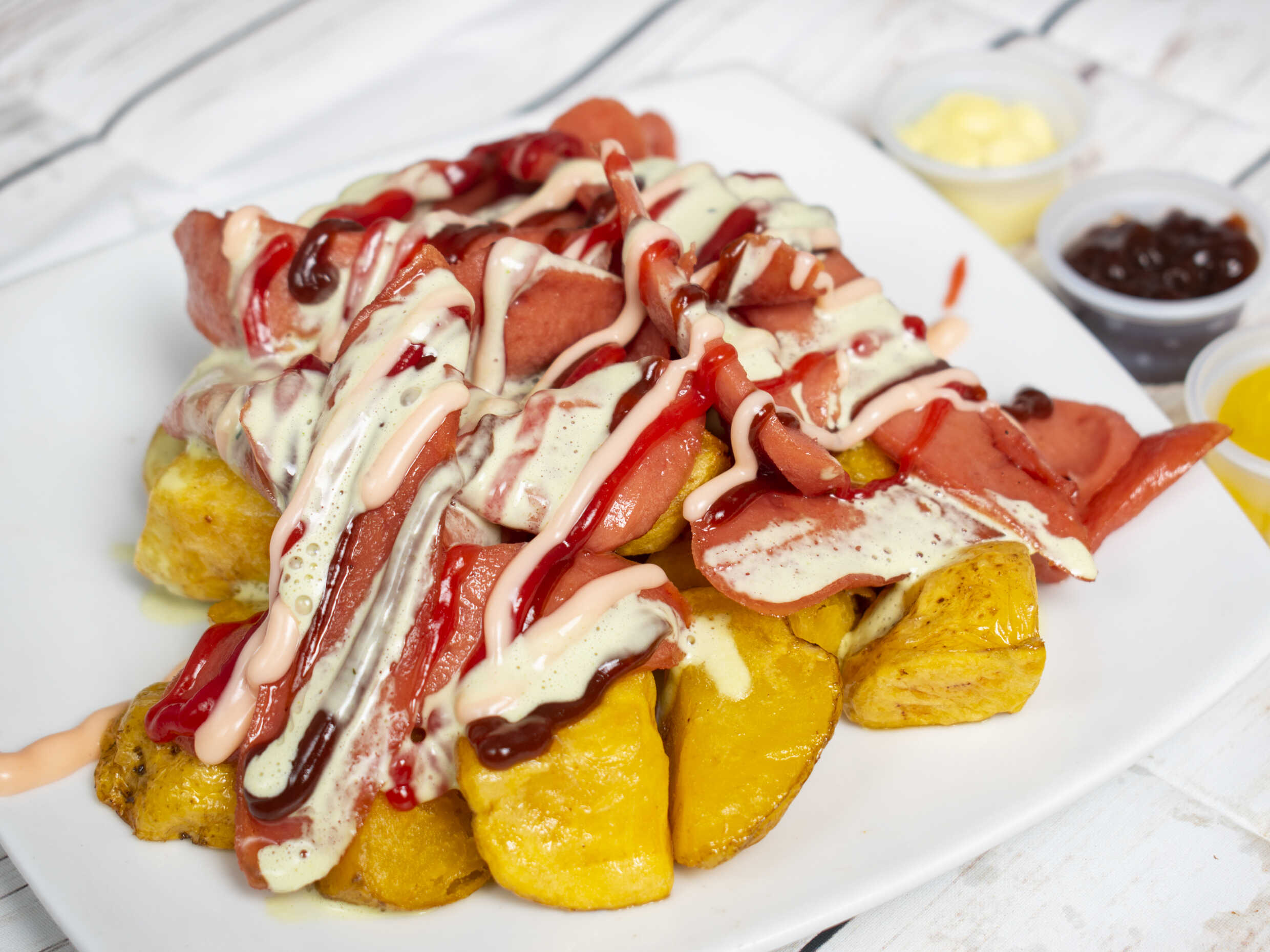 Salchicha, papa amarilla, costilla ahumada, pollo, carne de hamburguesa, chorizo, tocineta, ripio y salsas al gusto, queso