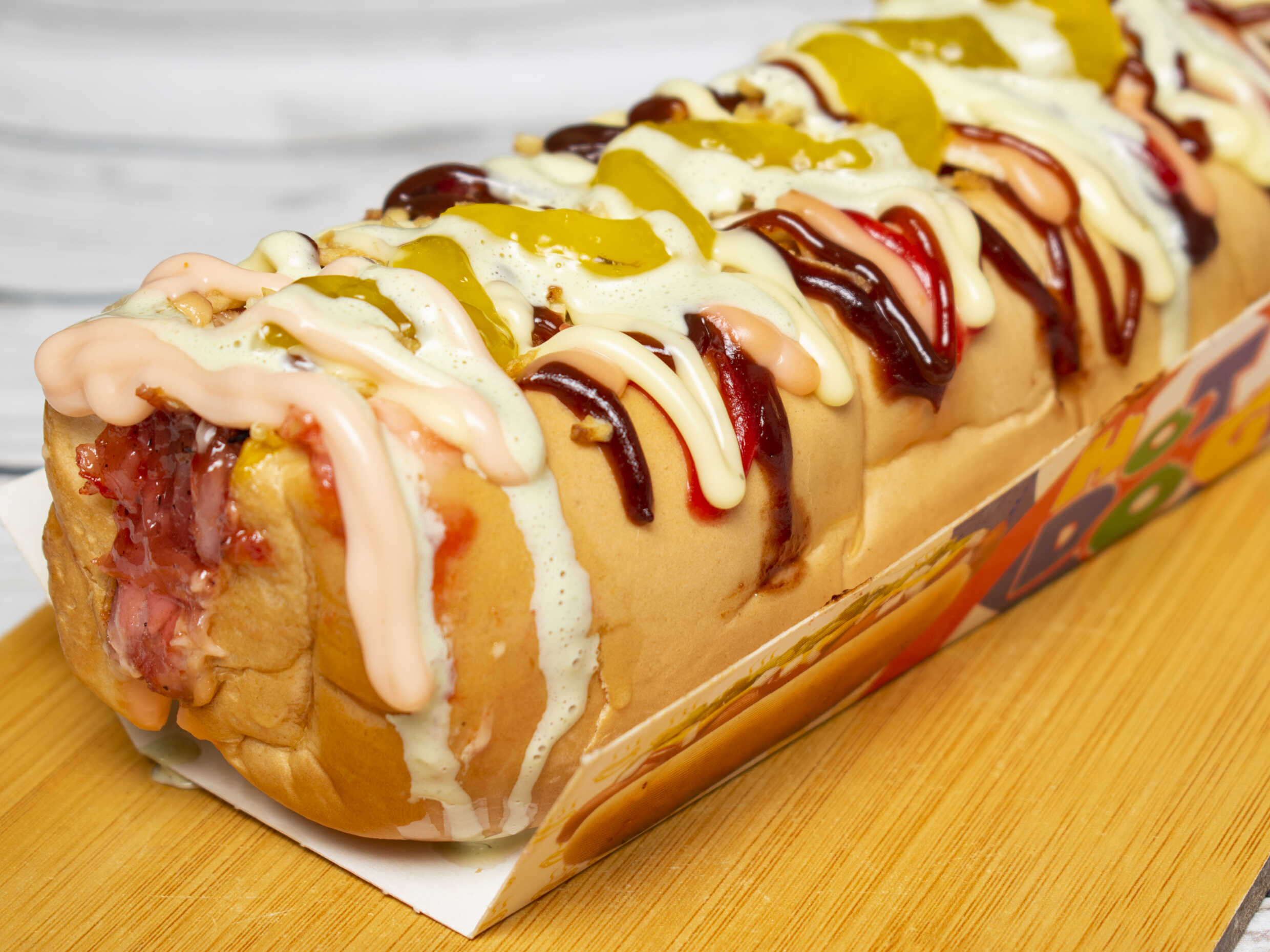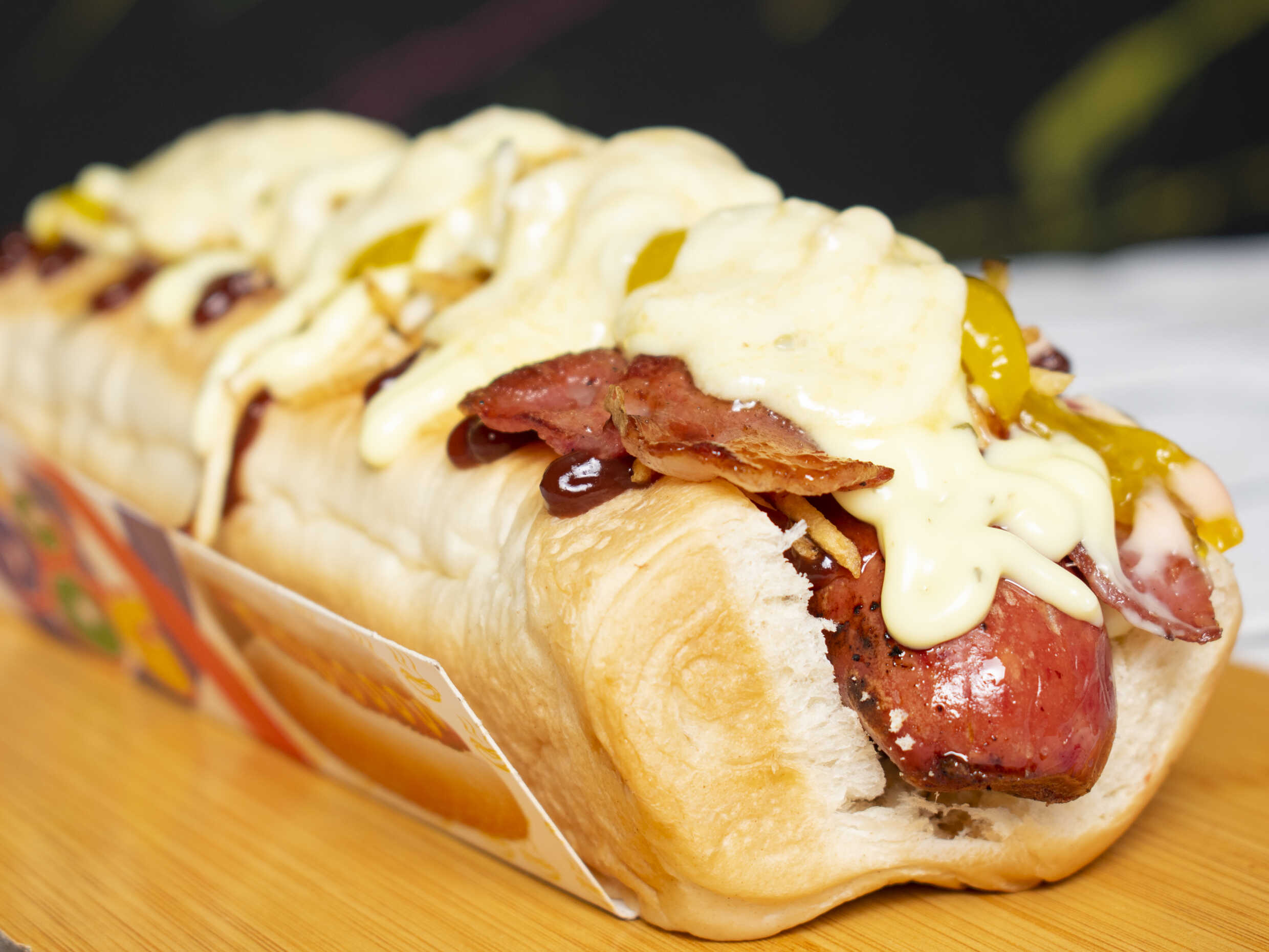 Pan, salchicha, ripio, tocineta, queso, cebolla y salsas al gusto