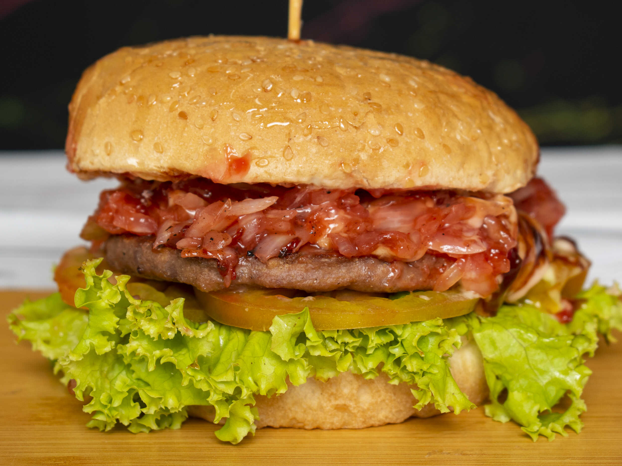 Pan, salsas al gusto, ripio, carne de hamburguesa, lechuga, tomate, cebolla, tocineta, jamón y cubierta de queso.