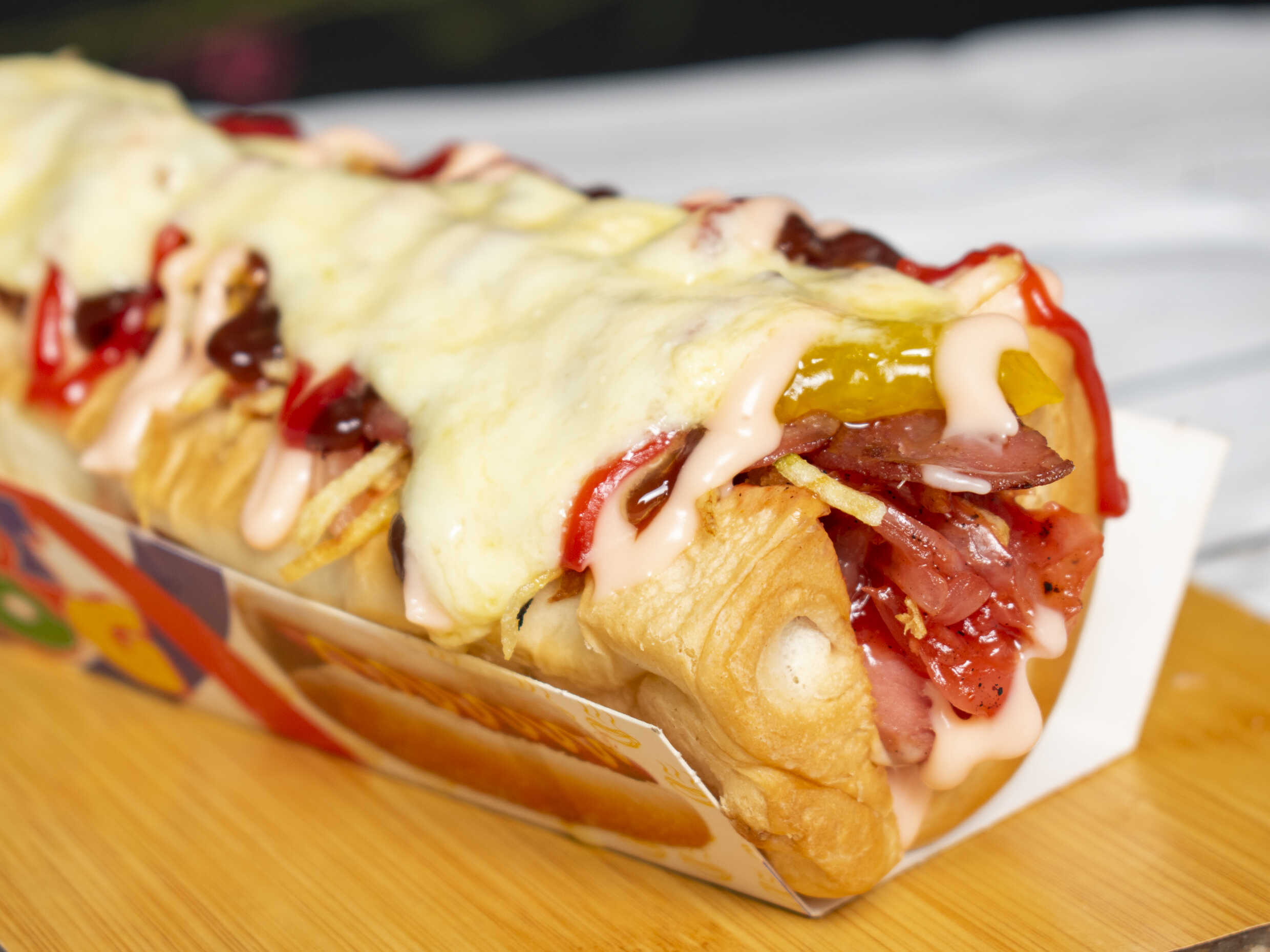 Pan, chorizo, ripio, tocineta, queso, cebolla y salsas al gusto