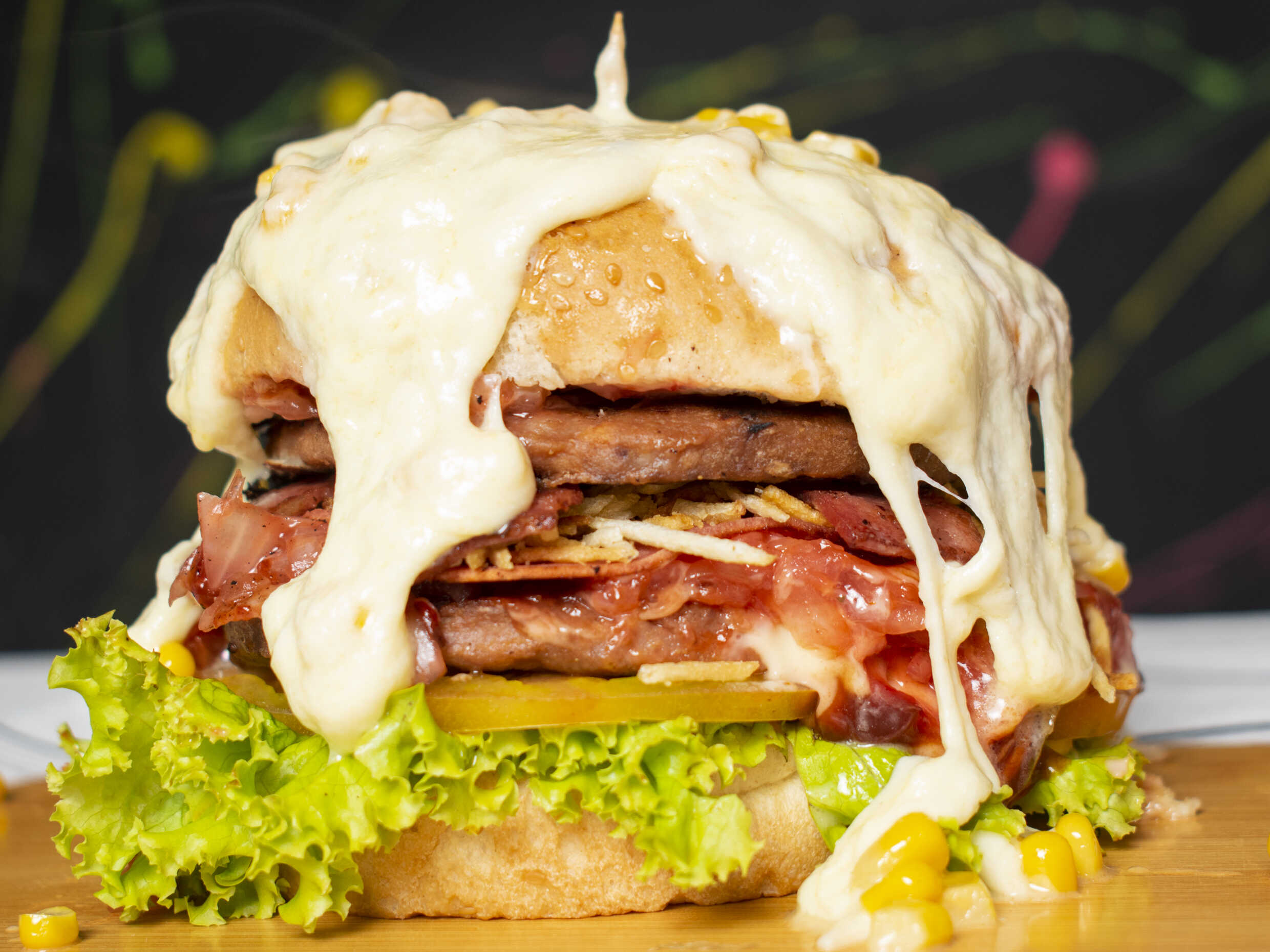 Pan, salsas al gusto, ripio, doble carne de hamburguesa, lechuga, tomate, cebolla, tocineta, jamón, maicitos y cubierta de .queso