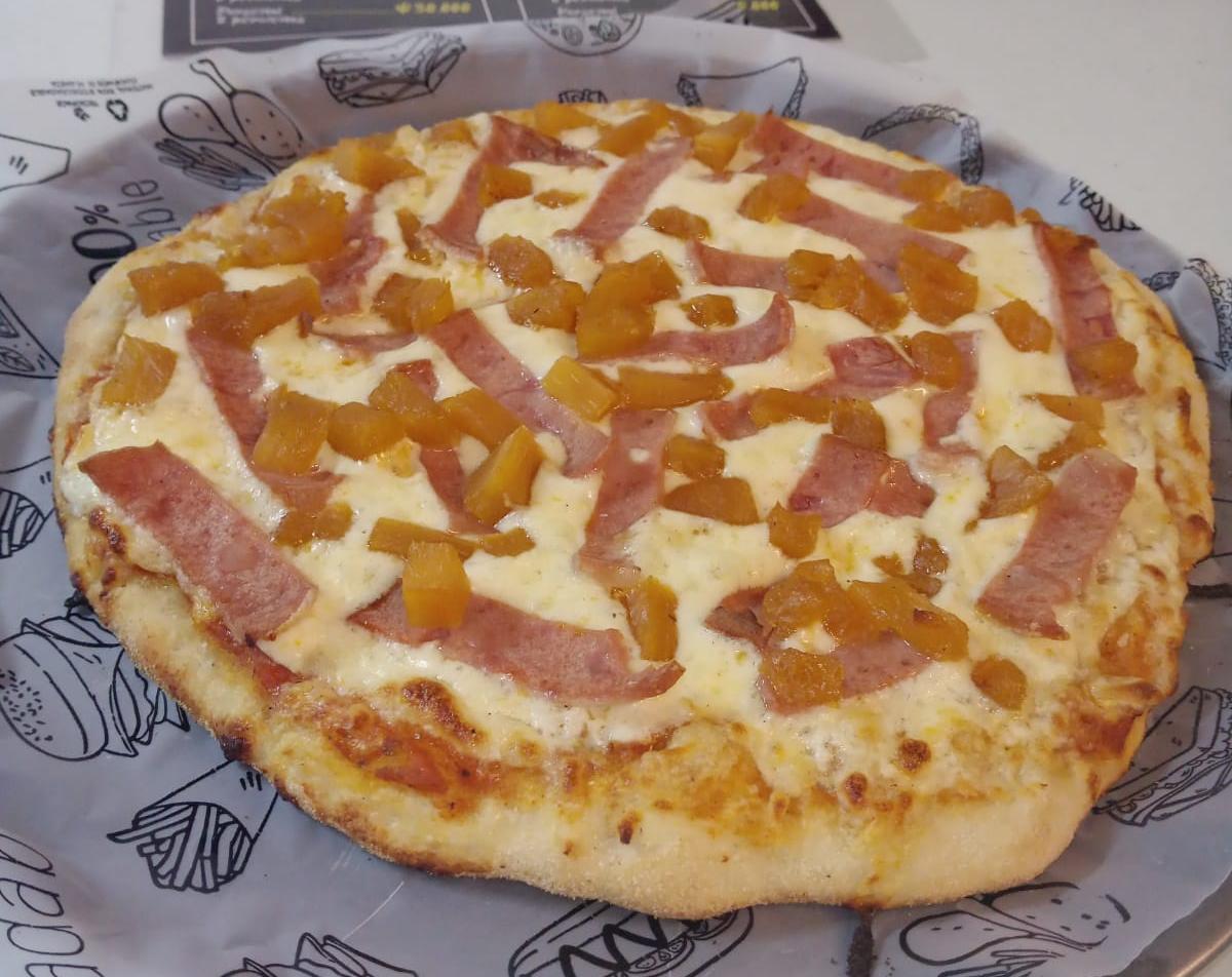 4 Porciones. Masa artesanal, salsa napolitana, queso mozzarella, piña calada, jamón.