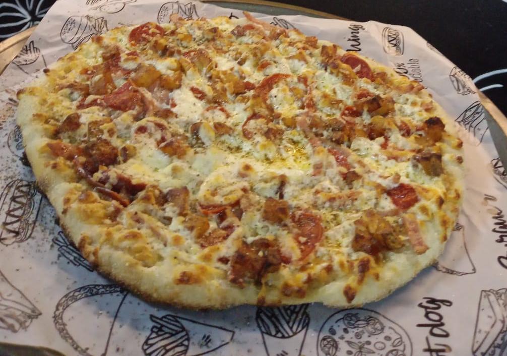 4 Porciones. Masa artesanal, salsa napolitana, jamón, cabano, tocineta.
