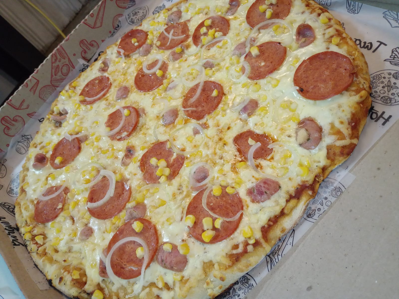 6 Porciones. Masa artesanal, salsa napolitana, queso mozzarella, chorizo, maíz, Pepperoni, cebolla.